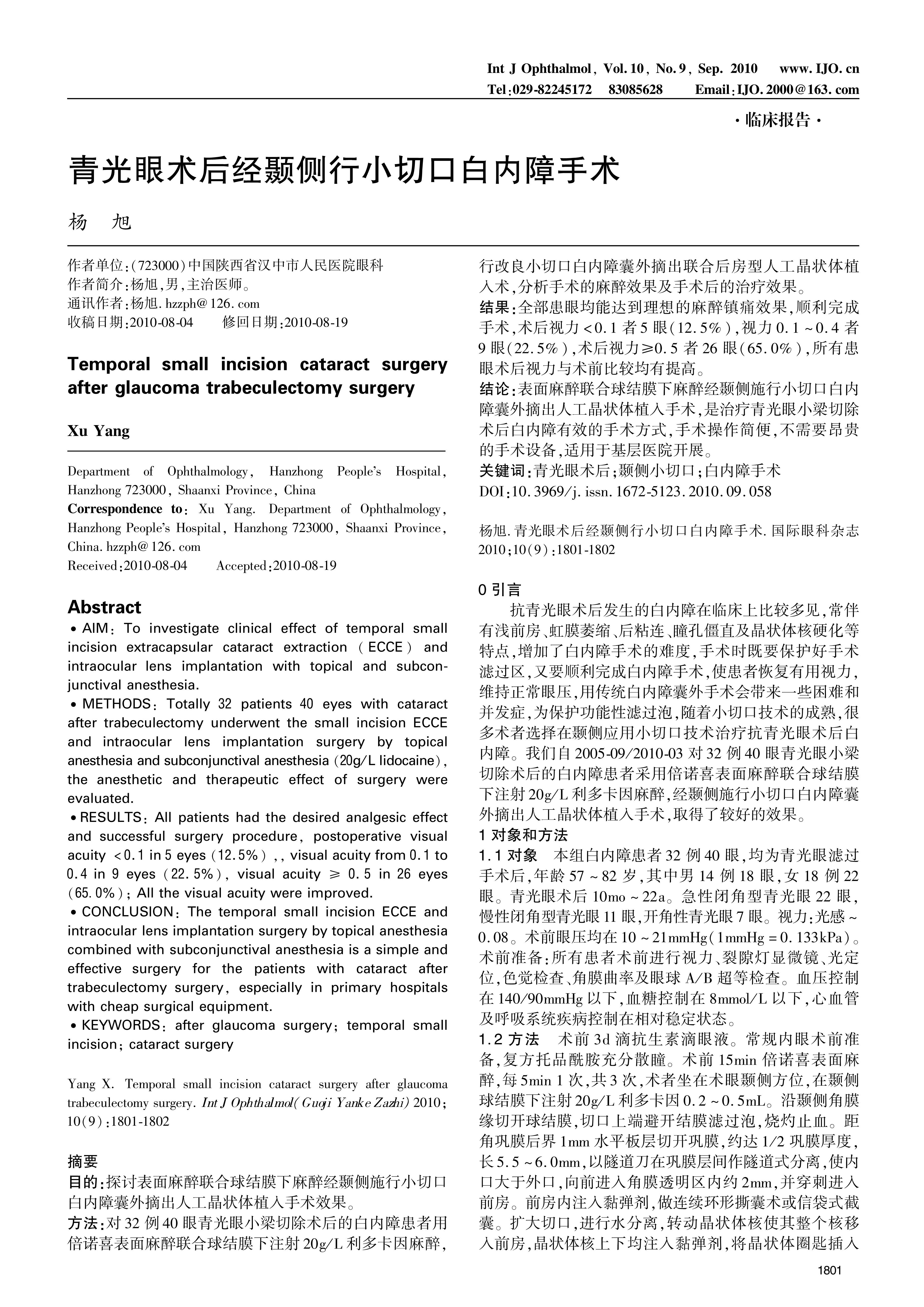 AIM:To investigate clinical effect of temporal small incision extracapsular cataract extraction (ECCE) and intraocular lens implantation with topical and subcon-junctival anesthesia. ·METHODS:Totally 32 patients 40 eyes with cataract after trabeculectomy underwent the small incision ECCE and intraocular lens implantation surgery by topical anesthesia and subconjunctival anesthesia (20g/L lidocaine),the anesthetic and therapeutic effect of surgery were evaluated. ·RESULTS:All patients had the desired analgesic effect and successful surgery procedure,postoperative visual acuity <0.1 in 5 eyes (12.5%) ,,visual acuity from 0.1 to 0.4 in 9 eyes (22.5%),visual acuity ≥ 0.5 in 26 eyes (65.0%); All the visual acuity were improved. ·CONCLUSION:The temporal small incision ECCE and intraocular lens implantation surgery by topical anesthesia combined with subconjunctival anesthesia is a simple and effective surgery for the patients with cataract after trabeculectomy surgery,especially in primary hospitals with cheap surgical equipment.