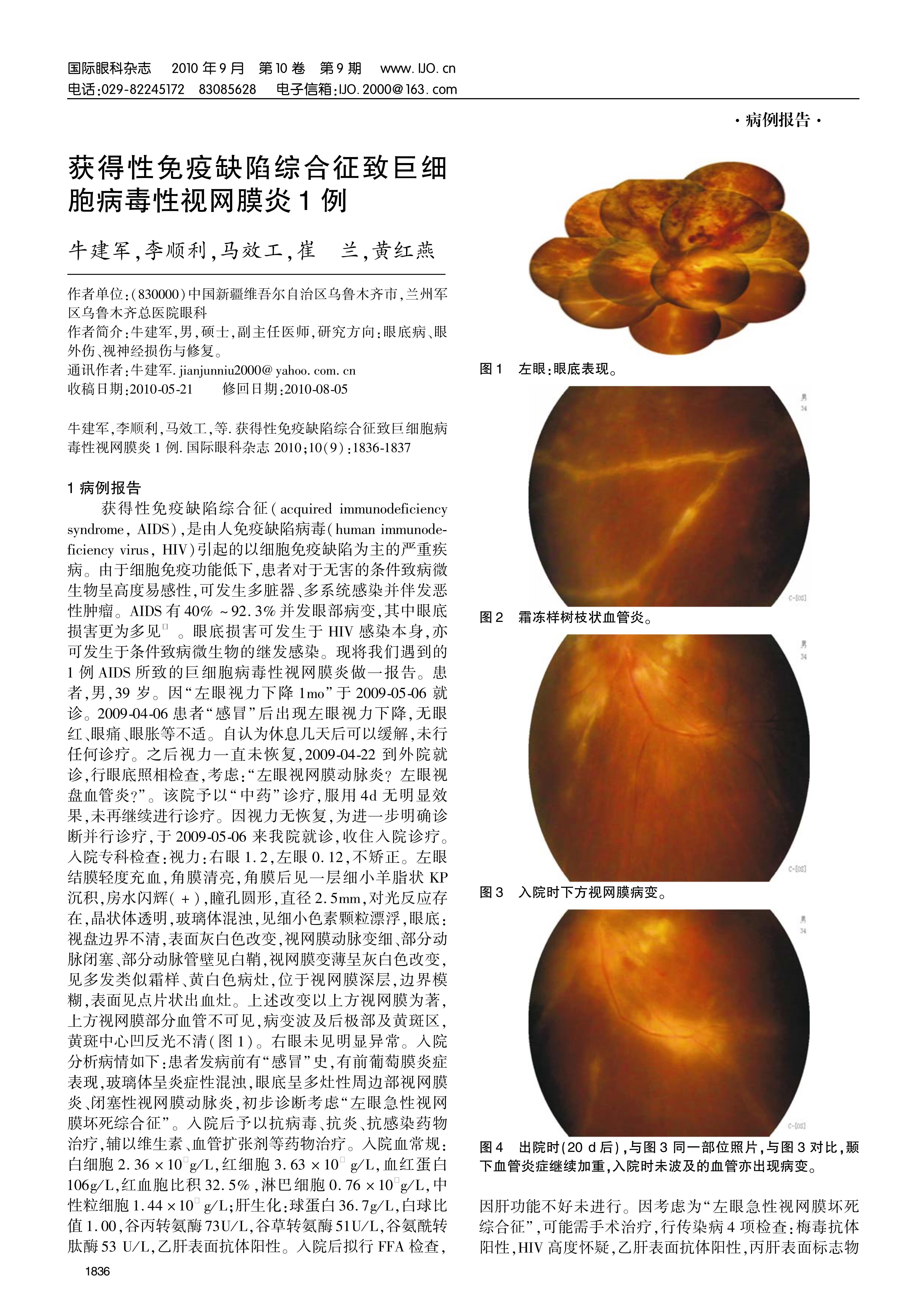 1病例报告获得性免疫缺陷综合征(acquired immunodeficiencysyndrome,AIDS),是由人免疫缺陷病毒(human immunode-ficiency virus,HIV)引起的以细胞免疫缺陷为主的严重疾病。由于细胞免疫功能低下,患者对于无害的条件致病微生物呈高度易感性,可发生多脏器、多系统感染并伴发恶性肿瘤。AIDS有40%~92.3%并发眼部病变,其中眼底损害更为多见[1]。眼底损害可发生于HIV感染本身,亦可发生于条件致病微生物的继发感染。现将我们遇到的1例AIDS所致的巨细胞病毒性视网膜炎做一报告。患者,男,39岁。因“左眼视力下降1mo”于2009-05-