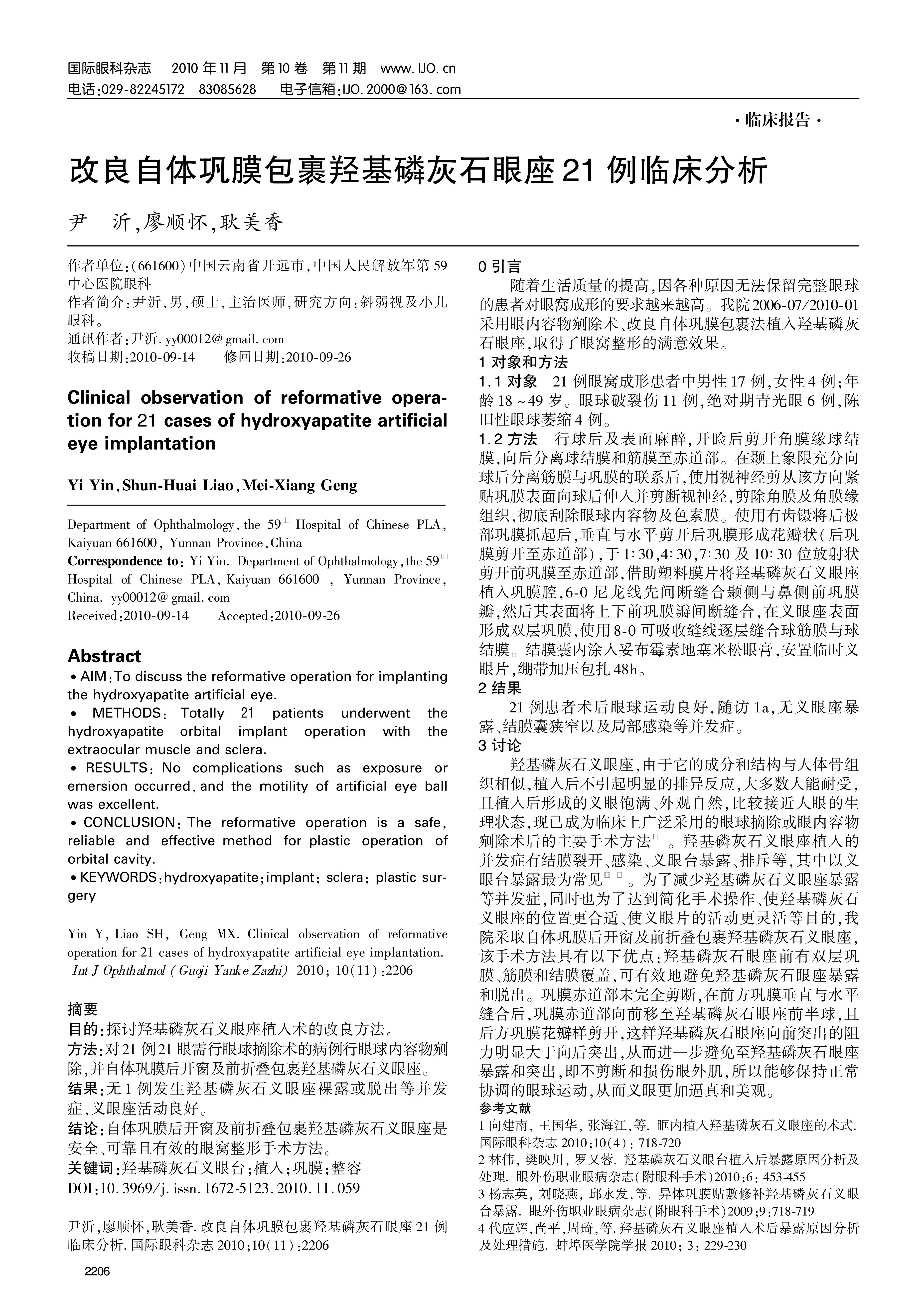 ·AIM:To discuss the reformative operation for implanting the hydroxyapatite artificial eye.·METHODS:Totally 21 patients underwent the hydroxyapatite orbital implant operation with the extraocular muscle and sclera.·RESULTS:No complications such as exposure or emersion occurred,and the motility of artificial eye ball was excellent.·CONCLUSION:The reformative operation is a safe,reliable and effective method for plastic operation of orbital cavity.·