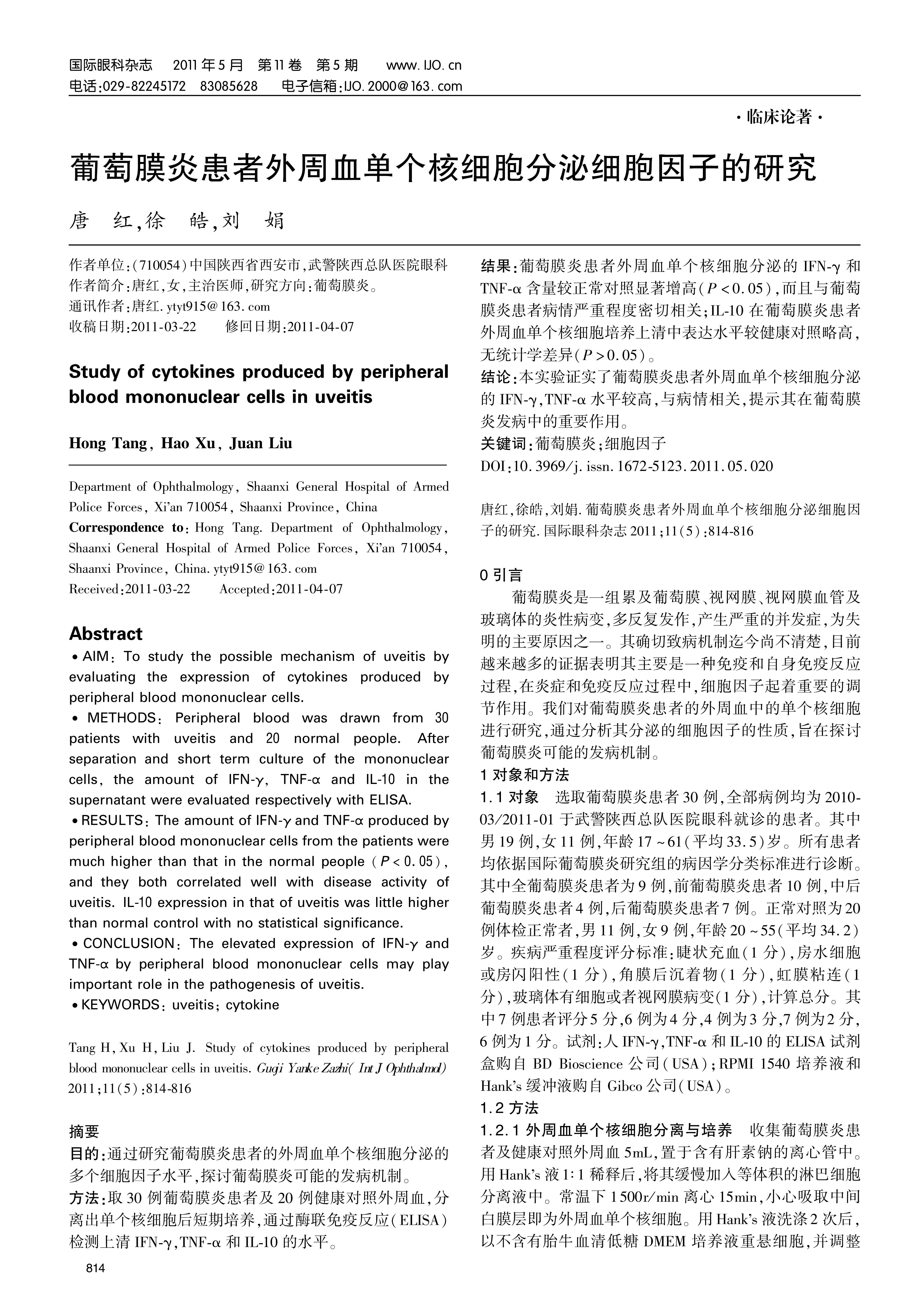 ·AIM:To study the possible mechanism of uveitis by evaluating the expression of cytokines produced by peripheral blood mononuclear cells.·METHODS:Peripheral blood was drawn from 30 patients with uveitis and 20 normal people.After separation and short term culture of the mononuclear cells,the amount of IFN-γ,TNF-α and IL-10 in the supernatant were evaluated respectively with ELlSA.·RESULTS:The amount of IFN-γ and TNF-α produced by peripheral blood mononuclear cells from the patients were much higher than that in the normal people(P<0.05),and they both correlated well with disease activity of uveitis.IL-10 expression in that of uveitis was little higher than normal control with no statistical significance.·CONCLUSION:The elevated expression of IFN-γ and TNF-α by peripheral blood mononuclear cells may play important role in the pathogenesis of uveitis.·