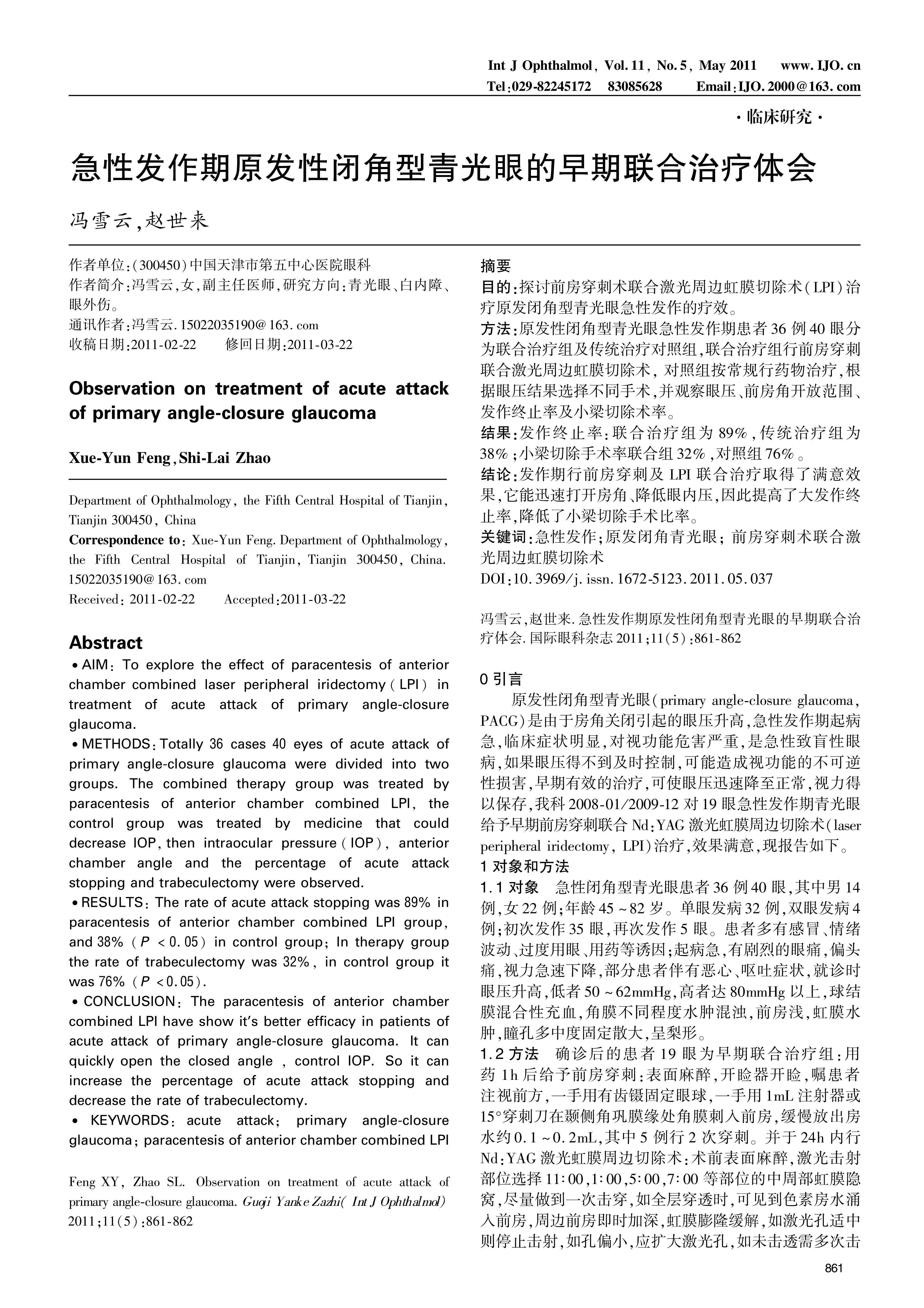 ·AIM:To explore the effect of paracentesis of anterior chamber combined laser peripheral iridectomy(LPI)in treatment of acute attack of primary angle-closure glaucoma.·METHODS:Totally 36 cases 40 eyes of acute attack of primary angle-closure glaucoma were divided into two groups.The combined therapy group was treated by paracentesis of anterior chamber combined LPI,the control group was treated by medicine that could decrease IOP,then intraocular pressure(IOP),anterior chamber angle and the percentage of acute attack stopping and trabeculectomy were observed.·RESULTS:The rate of acute attack stopping was 89% in paracentesis of anterior chamber combined LPI group,and 38%(P <0.05)in control group;In therapy group the rate of trabeculectomy was 32%,in control group it was 76%(P <0.05).·CONCLUSION:The paracentesis of anterior chamber combined LPI have show it’s better efficacy in patients of acute attack of primary angle-closure glaucoma.It can quickly open the closed angle,control IOP.So it can increase the percentage of acute attack stopping and decrease the rate of trabeculectomy.·