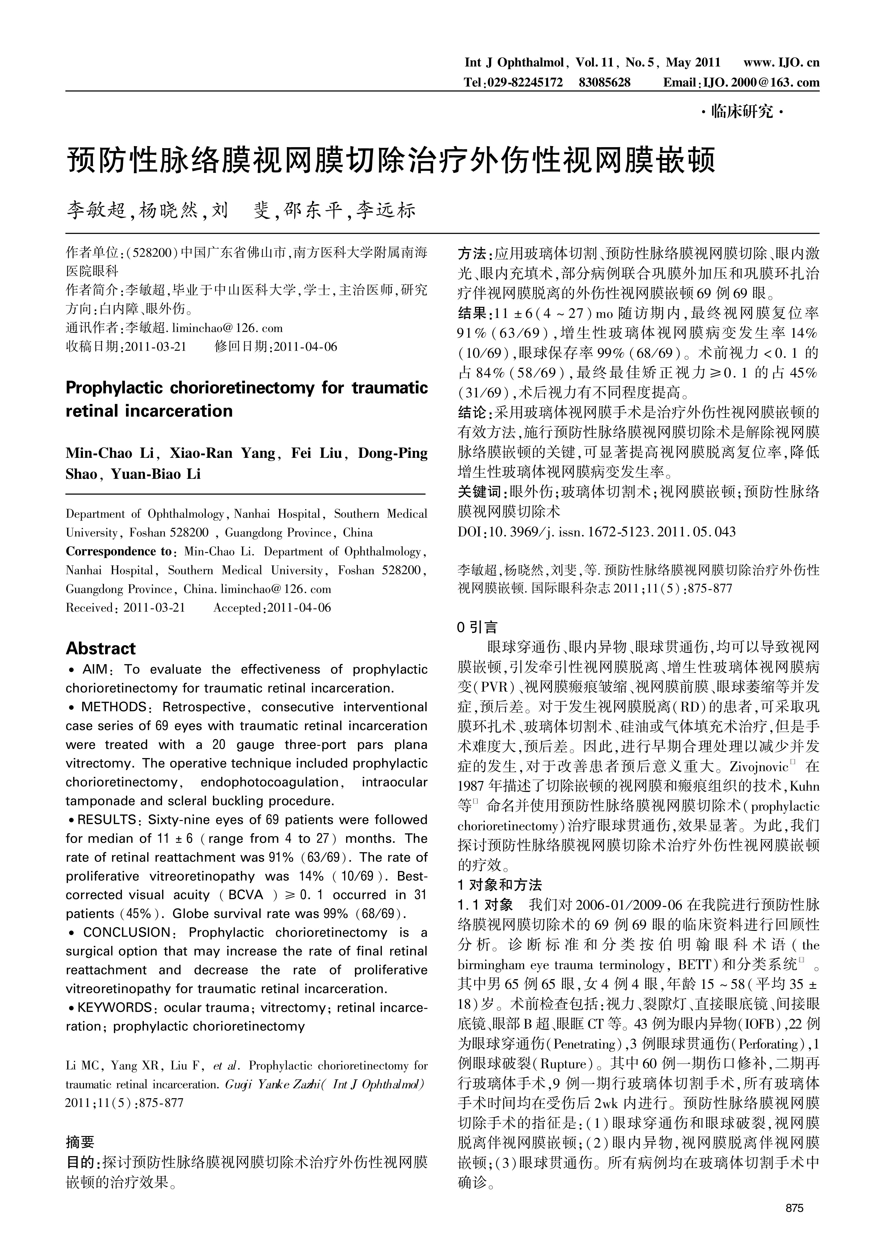 目的:探讨预防性脉络膜视网膜切除术治疗外伤性视网膜嵌顿的治疗效果。方法:应用玻璃体切割、预防性脉络膜视网膜切除、眼内激光、眼内充填术,部分病例联合巩膜外加压和巩膜环扎治疗伴视网膜脱离的外伤性视网膜嵌顿69例69眼。结果:11±6(4~27)mo随访期内,最终视网膜复位率91%(63/69),增生性玻璃体视网膜病变发生率14%(10/69),眼球保存率99%(68/69)。术前视力<0.1的占84%(58/69),最终最佳矫正视力≥0.1的占45%(31/69),术后视力有不同程度提高。结论:采用玻璃体视网膜手术是治疗外伤性视网膜嵌顿的有效方法,施行预防性脉络膜视网膜切除术是解除视网膜脉络膜嵌顿的关键,可显著提高视网膜脱离复位率,降低增生性玻璃体视网膜病变发生率。