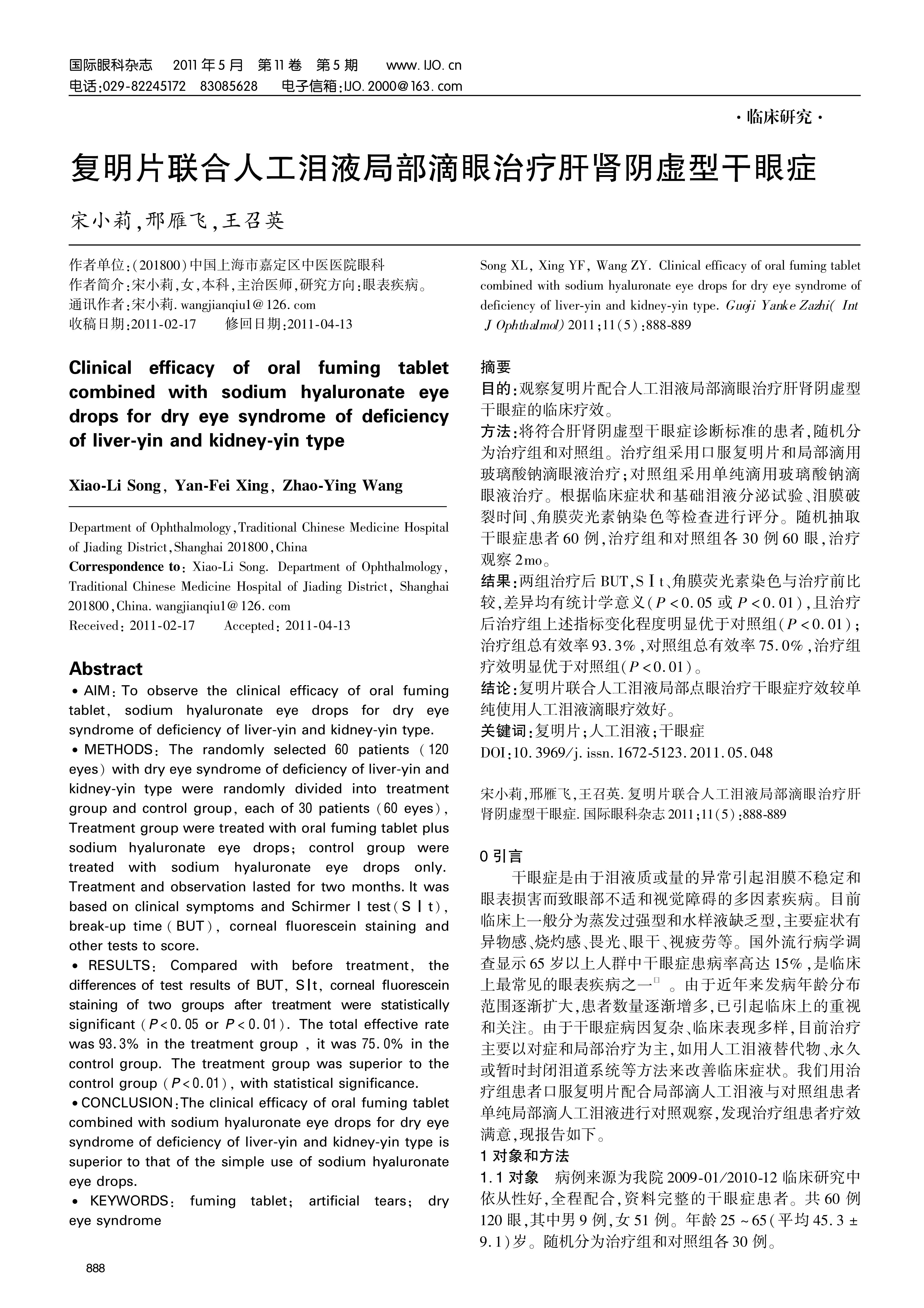 ·AIM:To observe the clinical efficacy of oral fuming tablet,sodium hyaluronate eye drops for dry eye syndrome of deficiency of liver-yin and kidney-yin type.·METHODS:The randomly selected 60 patients(120 eyes)with dry eye syndrome of deficiency of liver-yin and kidney-yin type were randomly divided into treatment group and control group,each of 30 patients(60 eyes),Treatment group were treated with oral fuming tablet plus sodium hyaluronate eye drops;control group were treated with sodium hyaluronate eye drops only.Treatment and observation lasted for two months.It was based on clinical symptoms and Schirmer I test(SⅠt),break-up time(BUT),corneal fluorescein staining and other tests to score.·RESULTS:Compared with before treatment,the differences of test results of BUT,SⅠt,corneal fluorescein staining of two groups after treatment were statistically significant(P<0.05 or P<0.01).The total effective rate was 93.3% in the treatment group,it was 75.0% in the control group.The treatment group was superior to the control group(P<0.01),with statistical significance.·CONCLUSION:The clinical efficacy of oral fuming tablet combined with sodium hyaluronate eye drops for dry eye syndrome of deficiency of liver-yin and kidney-yin type is superior to that of the simple use of sodium hyaluronate eye drops.·