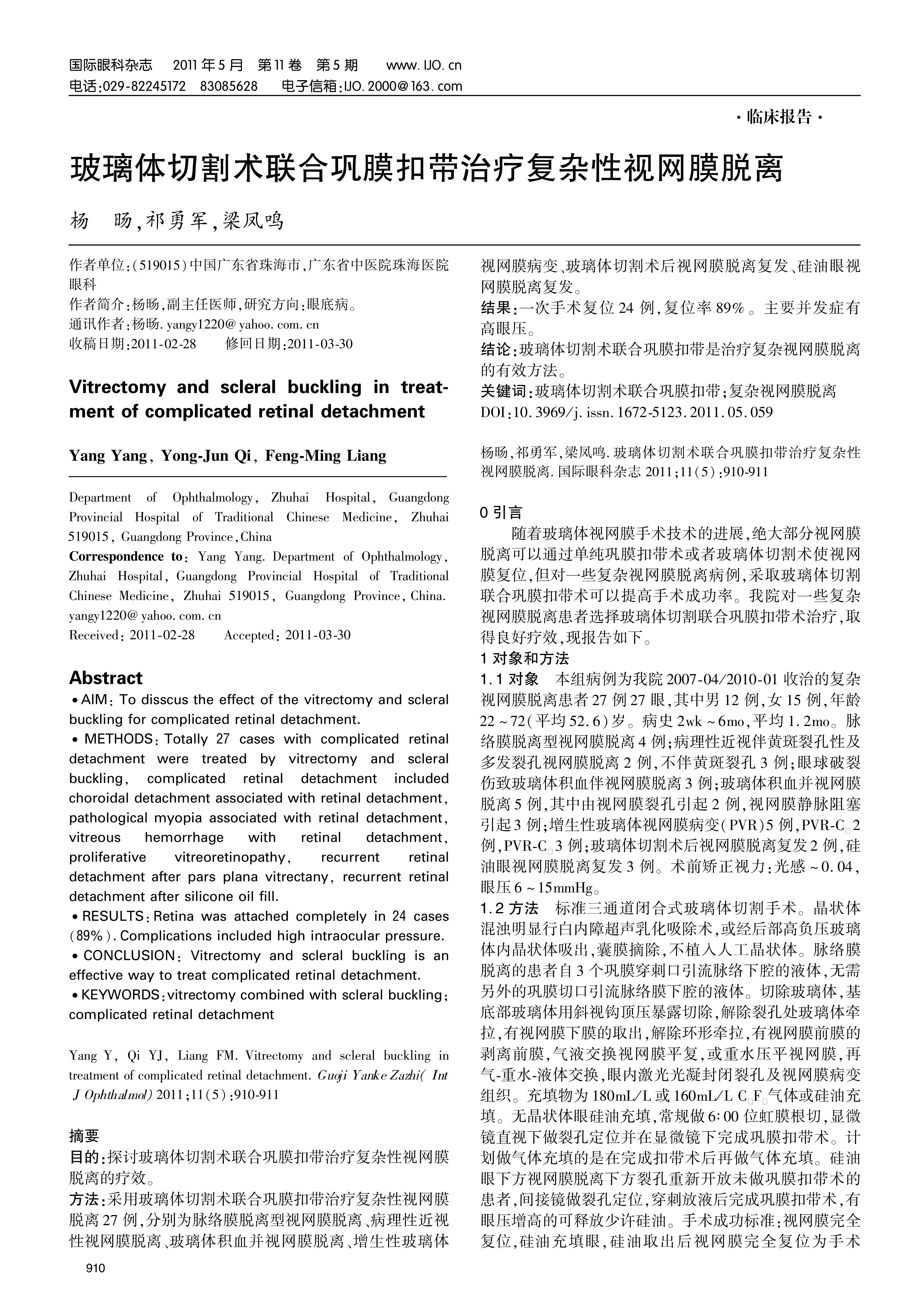 ·AIM:To disscus the effect of the vitrectomy and scleral buckling for complicated retinal detachment.·METHODS:Totally 27 cases with complicated retinal detachment were treated by vitrectomy and scleral buckling,complicated retinal detachment included choroidal detachment associated with retinal detachment,pathological myopia associated with retinal detachment,vitreous hemorrhage with retinal detachment,proliferative vitreoretinopathy,recurrent retinal detachment after pars plana vitrectany,recurrent retinal detachment after silicone oil fill.·RESULTS:Retina was attached completely in 24 cases(89%).Complications included high intraocular pressure.·CONCLUSION:Vitrectomy and scleral buckling is an effective way to treat complicated retinal detachment.·
