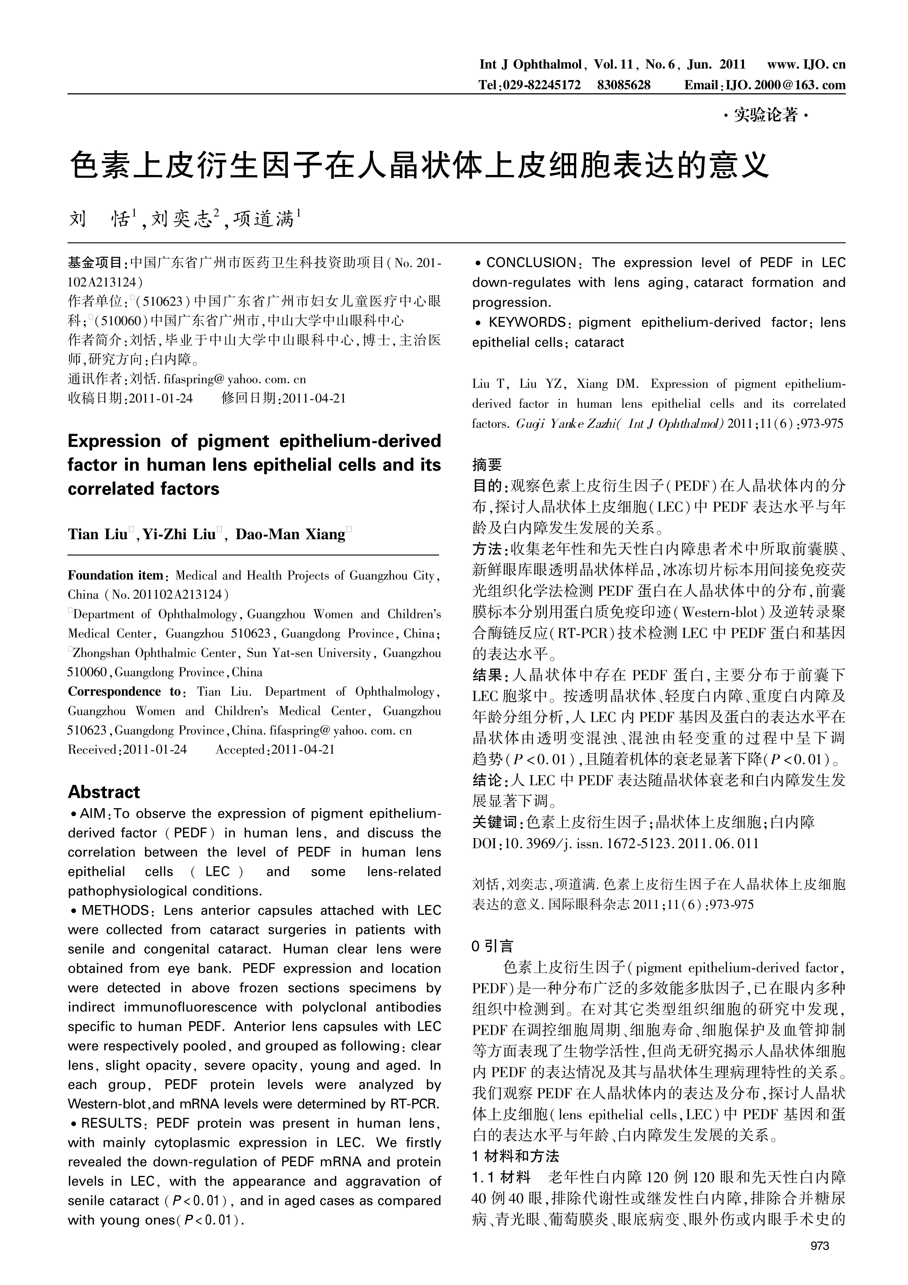 目的:观察色素上皮衍生因子(PEDF)在人晶状体内的分布,探讨人晶状体上皮细胞(LEC)中PEDF表达水平与年龄及白内障发生发展的关系。方法:收集老年性和先天性白内障患者术中所取前囊膜、新鲜眼库眼透明晶状体样品,冰冻切片标本用间接免疫荧光组织化学法检测PEDF蛋白在人晶状体中的分布,前囊膜标本分别用蛋白质免疫印迹(Western-blot)及逆转录聚合酶链反应(RT-PCR)技术检测LEC中PEDF蛋白和基因的表达水平。结果:人晶状体中存在PEDF蛋白,主要分布于前囊下LEC胞浆中。按透明晶状体、轻度白内障、重度白内障及年龄分组分析,人LEC内PEDF基因及蛋白的表达水平在晶状体由透明变混浊、混浊由轻变重的过程中呈下调趋势(P<0.01),且随着机体的衰老显著下降(P<0.01)。结论:人LEC中PEDF表达随晶状体衰老和白内障发生发展显著下调。