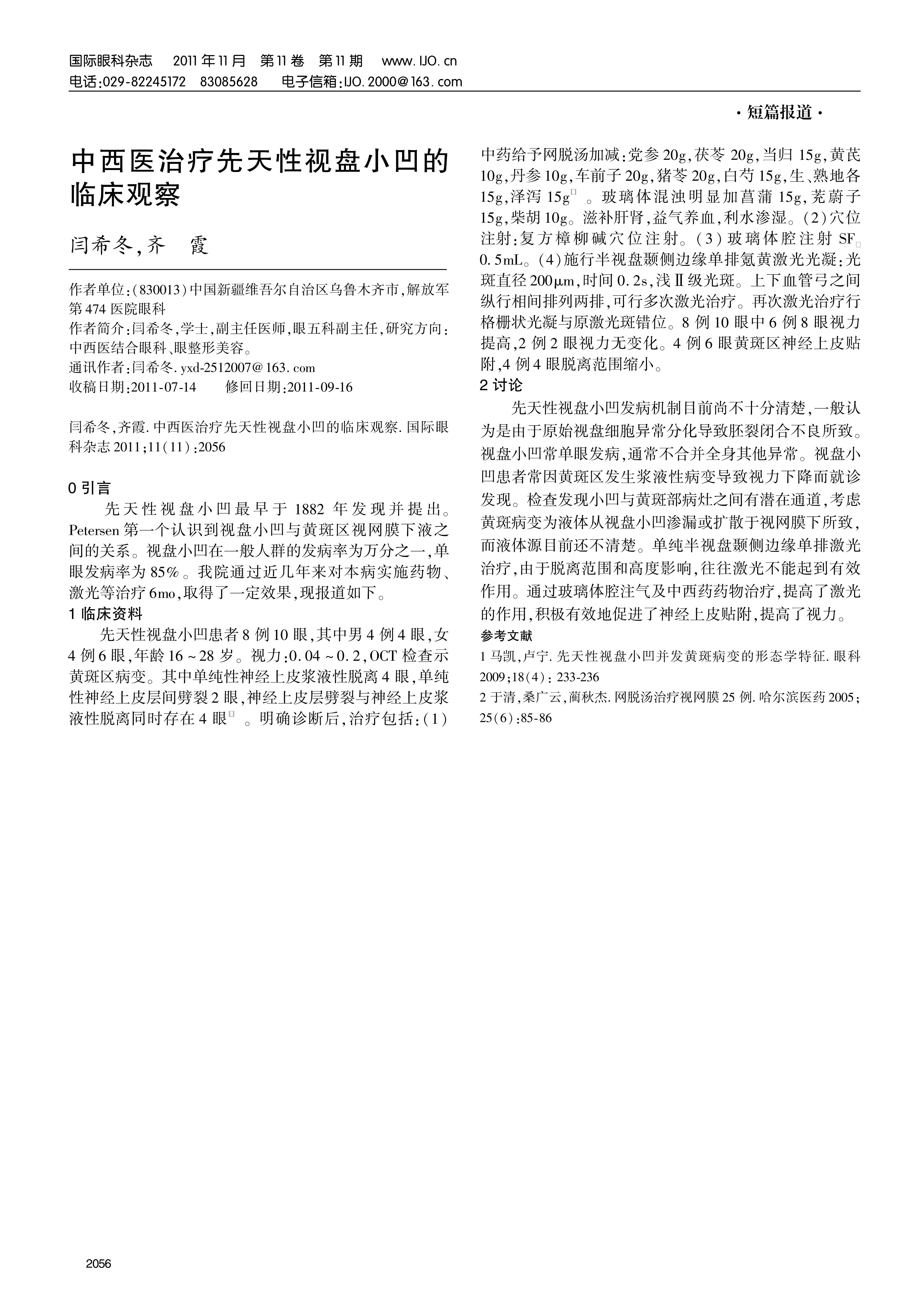 闫希冬,齐霞.中西医治疗先天性视盘小凹的临床观察.国际眼科杂志, 2011,11(11):2056.