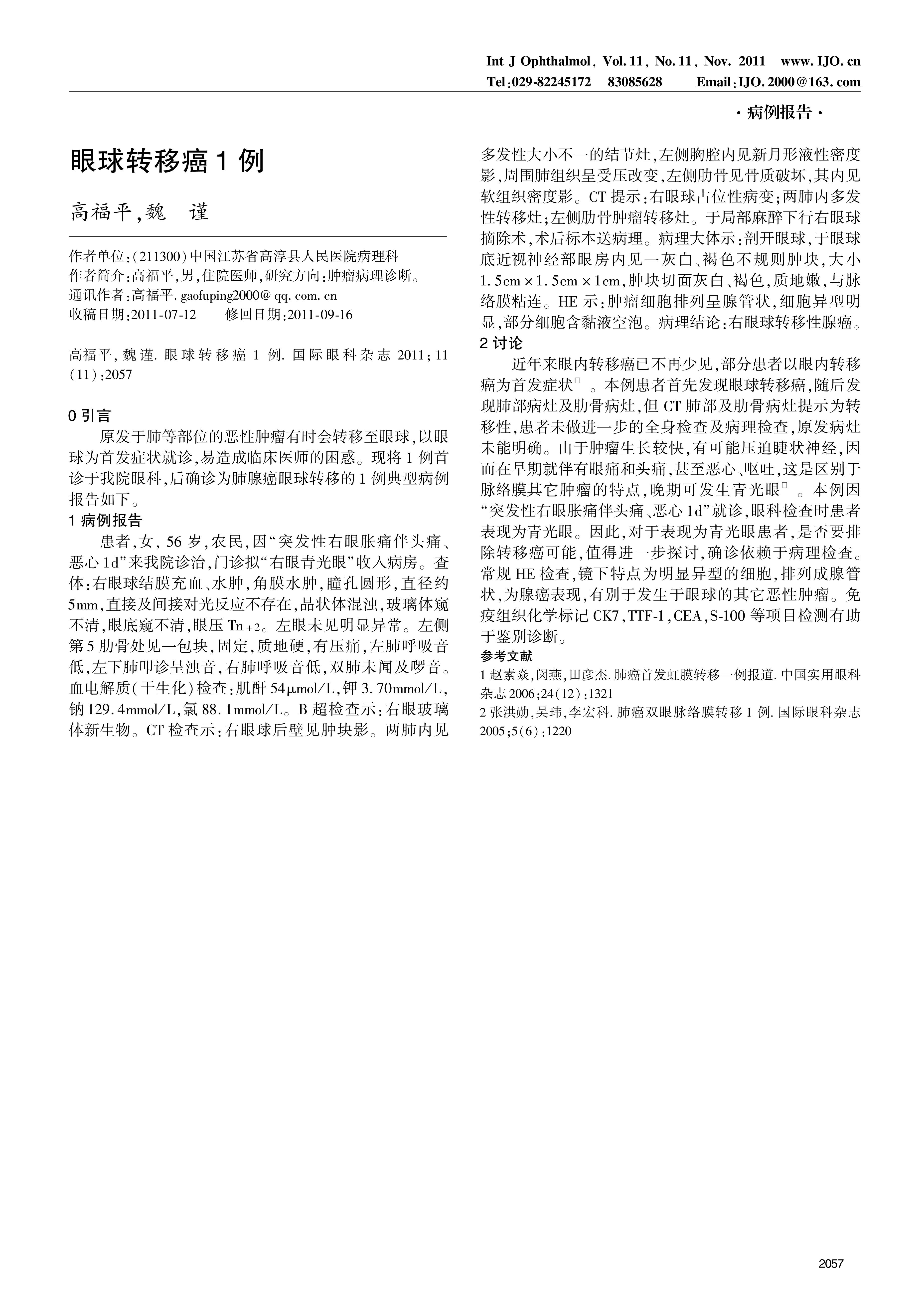 高福平,魏谨.眼球转移癌1例.国际眼科杂志, 2011,11(11):2057.