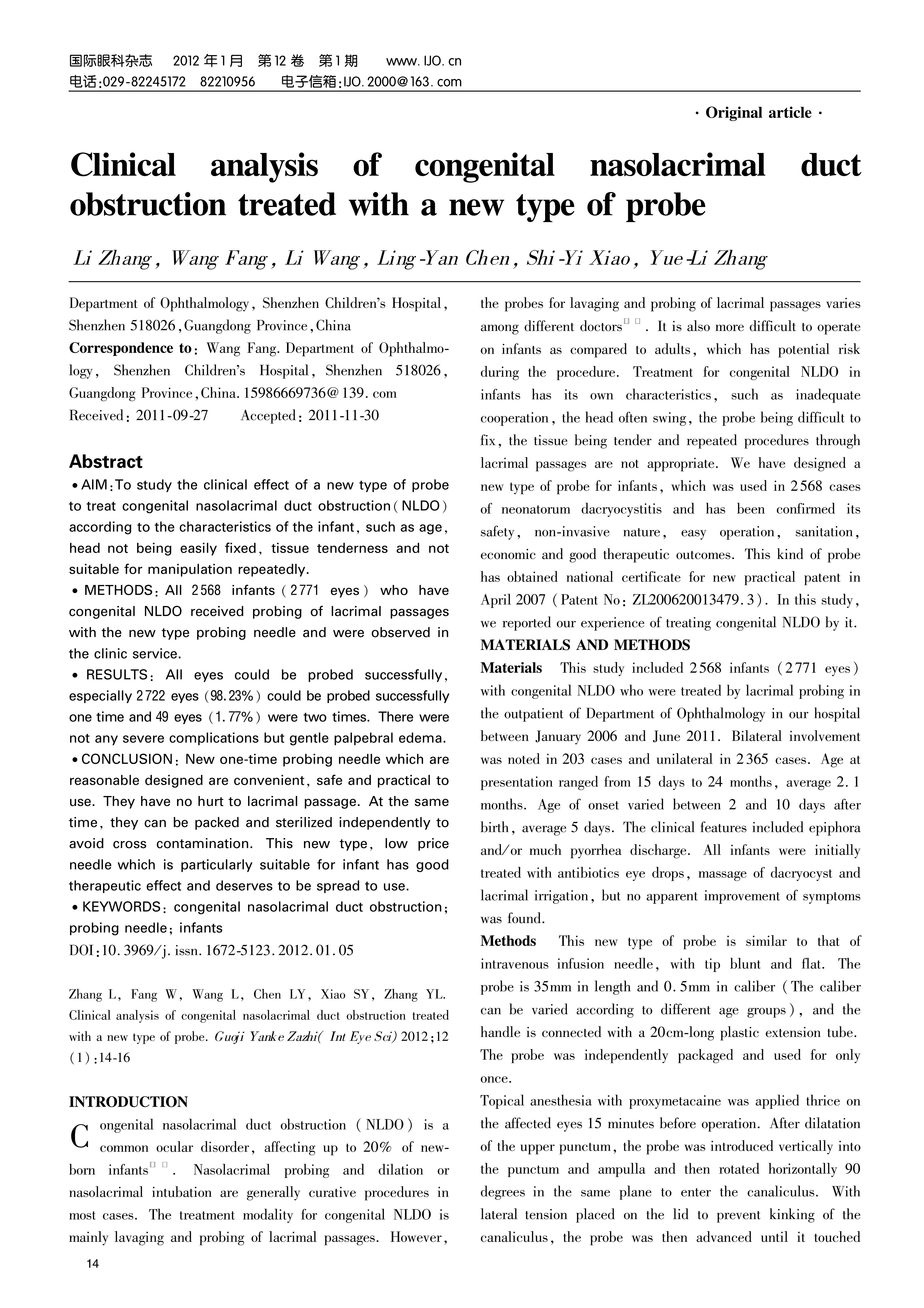 To study the clinical effect of a new type of probe to treat congenital nasolacrimal duct obstruction(NLDO) according to the characteristics of the infant, such as age, head not being easily fixed, tissue tenderness and not suitable for manipulation repeatedly. METHODS:All 2568 infants(2771 eyes) who have congenital NLDO received probing of lacrimal passages with the new type probing needle and were observed in the clinic service. RESULTS: All eyes could be probed successfully, especially 2722 eyes (98.23%) could be probed successfully one time and 49 eyes (1.77%) were two times. There were not any severe complications but gentle palpebral edema. CONCLUSION: New onetime probing needle which are reasonable designed are convenient, safe and practical to use. They have no hurt to lacrimal passage. At the same time, they can be packed and sterilized independently to avoid cross contamination. This new type, low price needle which is particularly suitable for infant has good therapeutic effect and deserves to be spread to use.