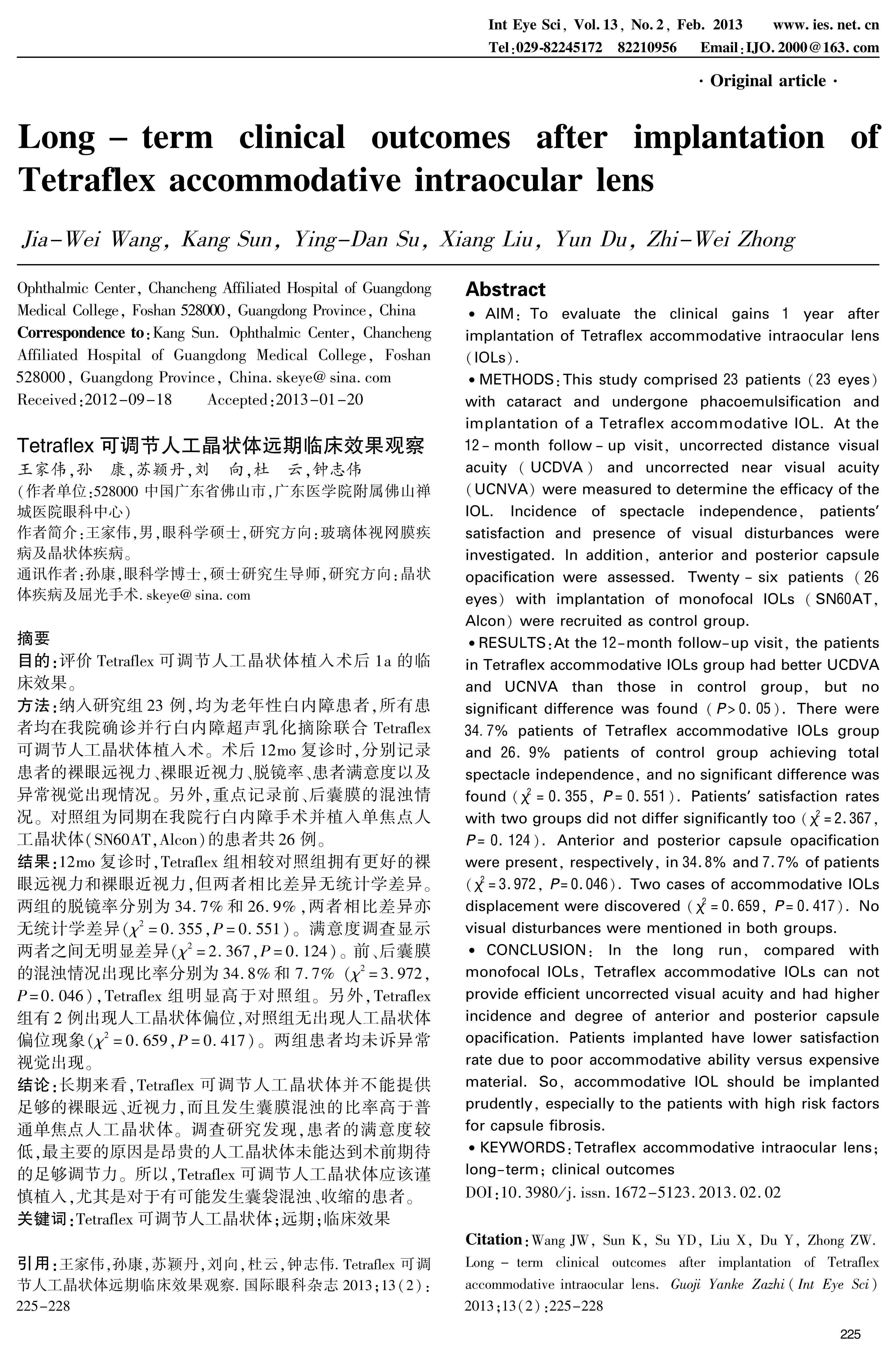 结论:长期来看,Tetraflex可调节人工晶状体并不能提供足够的裸眼远、近视力,而且发生囊膜混浊的比率高于普通单焦点人工晶状体。调查研究发现,患者的满意度较低,最主要的原因是昂贵的人工晶状体未能达到术前期待的足够调节力。所以,Tetraflex可调节人工晶状体应该谨慎植入,尤其是对于有可能发生囊袋混浊、收缩的患者。