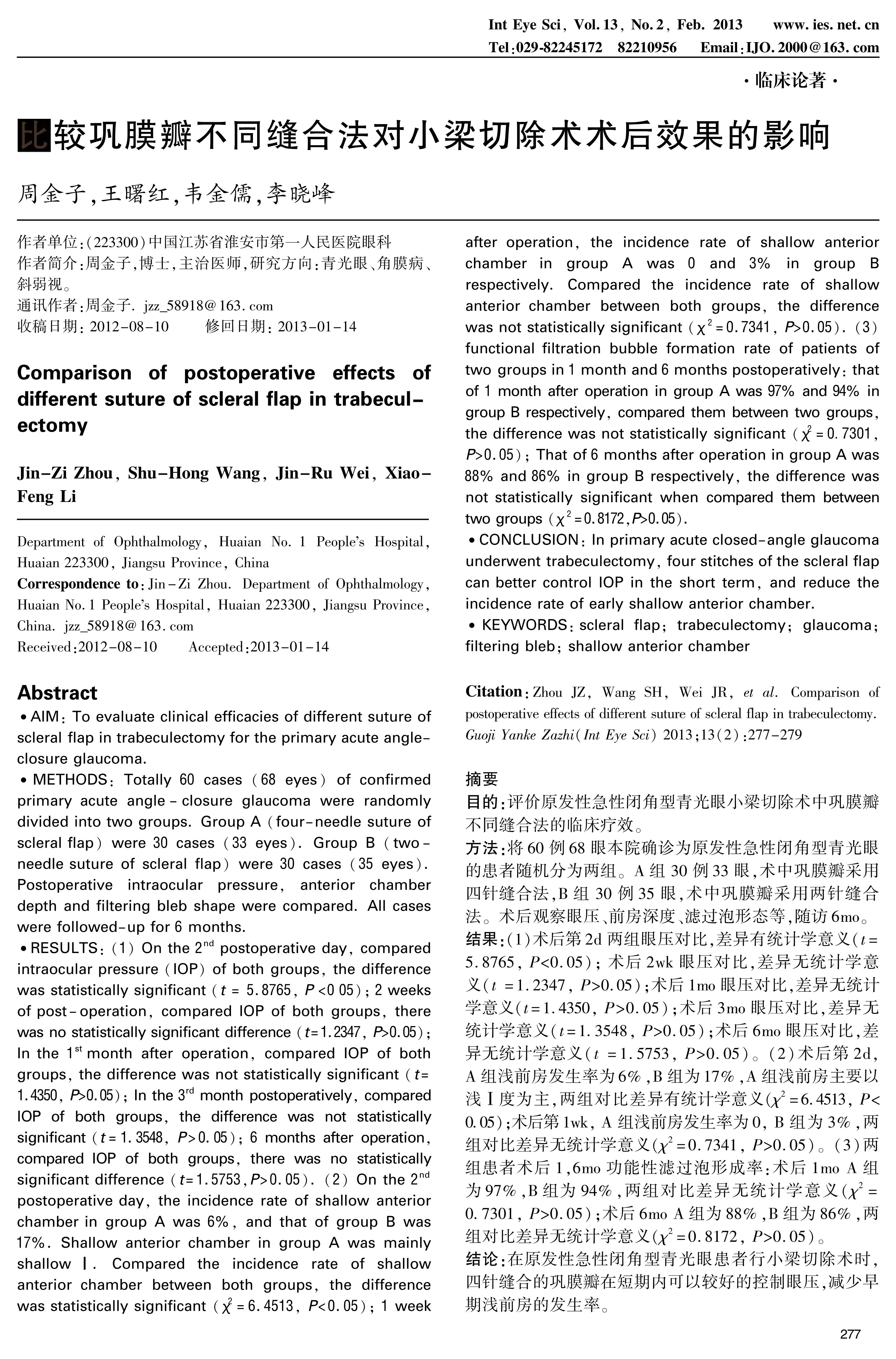 结果:(1)术后第2d两组眼压对比,差异有统计学意义(t=5.8765, P<0.05); 术后2wk眼压对比,差异无统计学意义(t =1.2347, P>0.05); 术后1mo眼压对比,差异无统计学意义(t=1.4350, P>0.05); 术后3mo眼压对比,差异无统计学意义(t=1.3548, P>0.05); 术后6mo眼压对比,差异无统计学意义(t =1.5753, P>0.05)。(2)术后第2d,A组浅前房发生率为6%,B组为17%,A组浅前房主要以浅Ⅰ度为主,两组对比差异有统计学意义(χ2=6.4513, P<0.05); 术后第1wk, A 组浅前房发生率为0, B组为3%,两组对比差异无统计学意义(χ2=0.7341, P>0.05)。(3)两组患者术后1,6mo功能性滤过泡形成率:术后1mo A组为97%,B组为94%,两组对比差异无统计学意义(χ2=0.7301, P>0.05); 术后6mo A组为88%,B组为86%,两组对比差异无统计学意义(χ2=0.8172, P>0.05)。