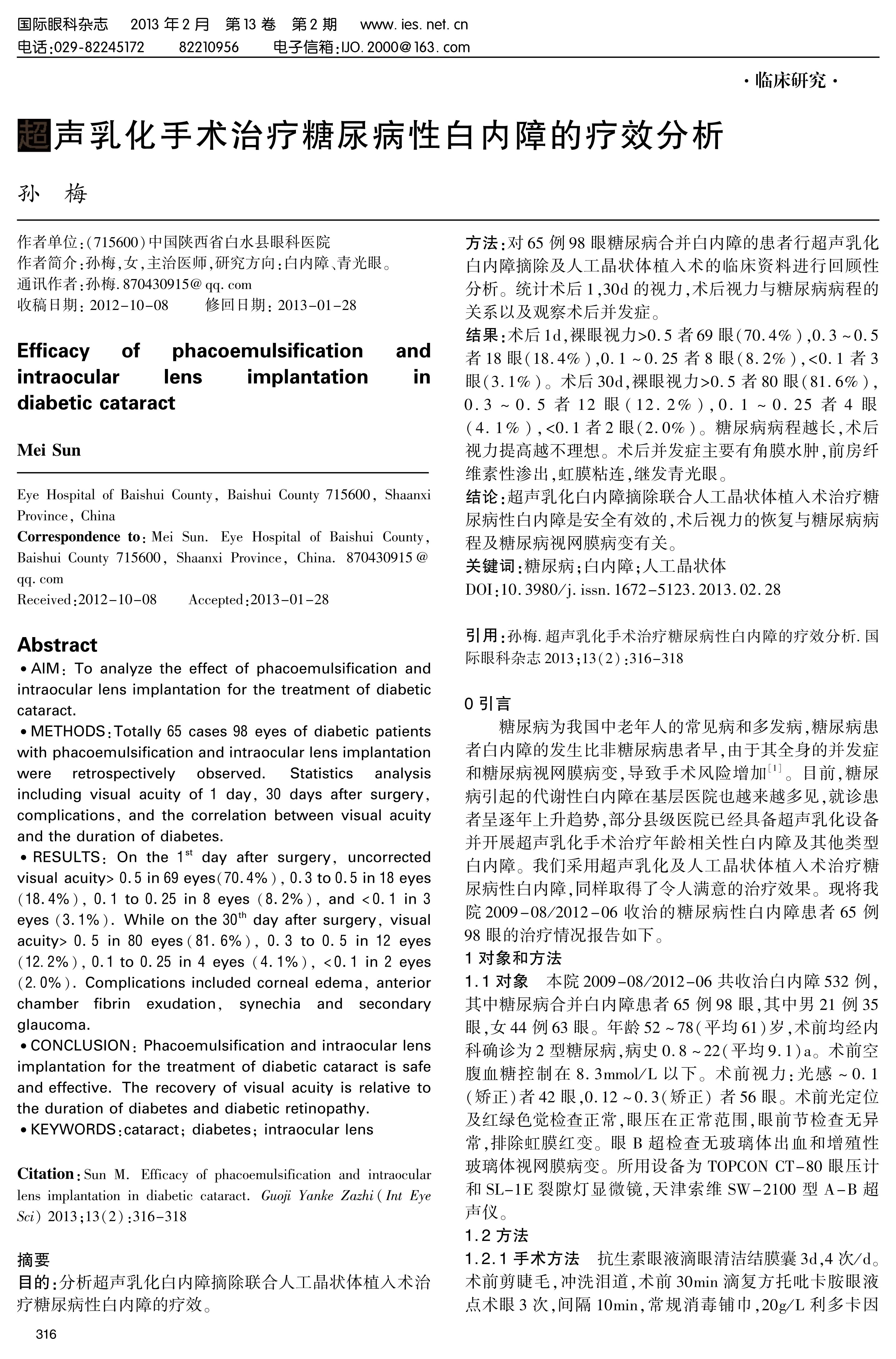 METHODS:Totally 65 cases 98 eyes of diabetic patients with phacoemulsification and intraocular lens implantation were retrospectively observed. Statistics analysis including visual acuity of 1 day, 30 days after surgery, complications, and the correlation between visual acuity and the duration of diabetes.