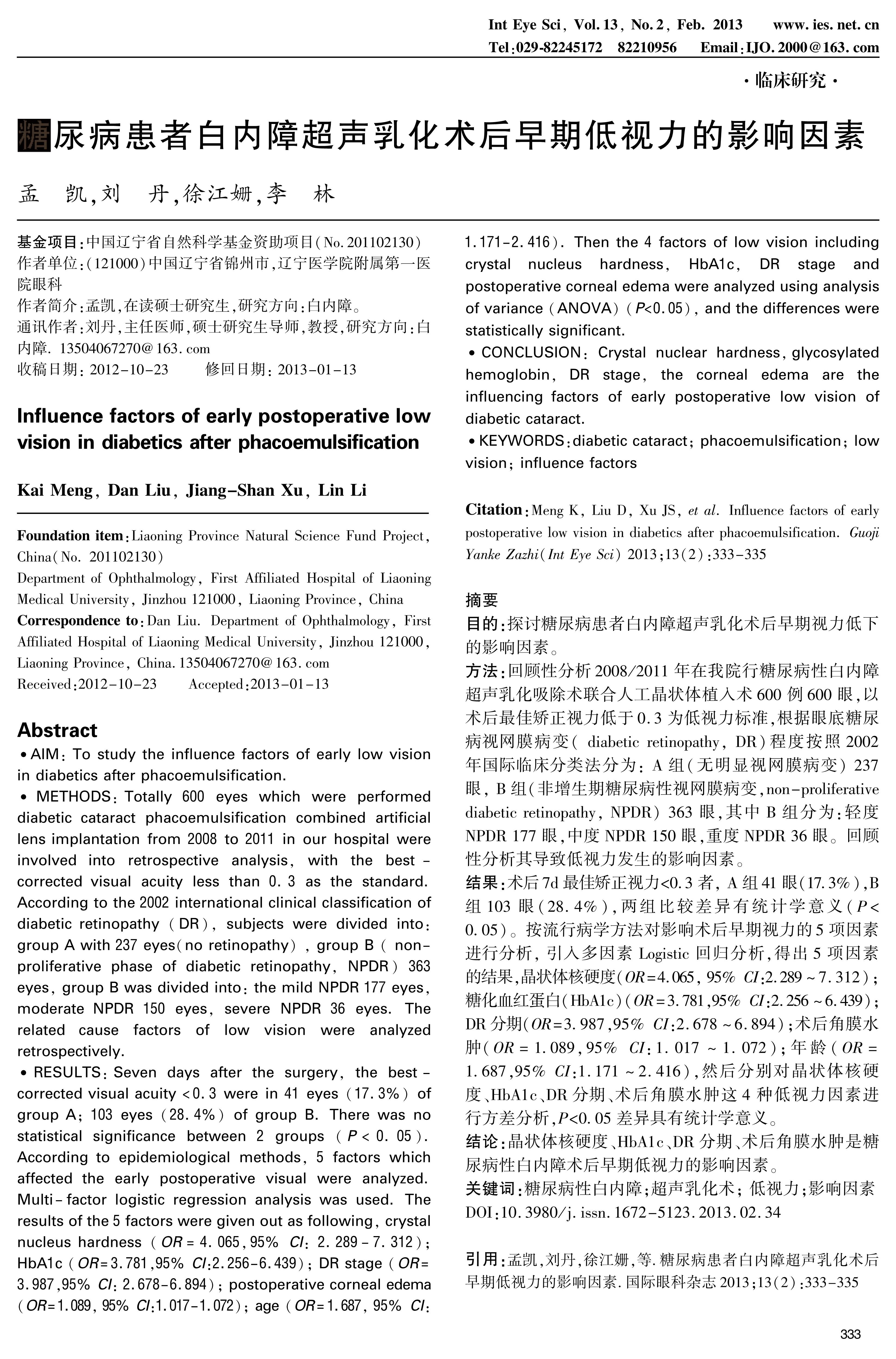 CONCLUSION: Crystal nuclear hardness,glycosylated hemoglobin, DR stage, the corneal edema are the influencing factors of early postoperative low vision of diabetic cataract.