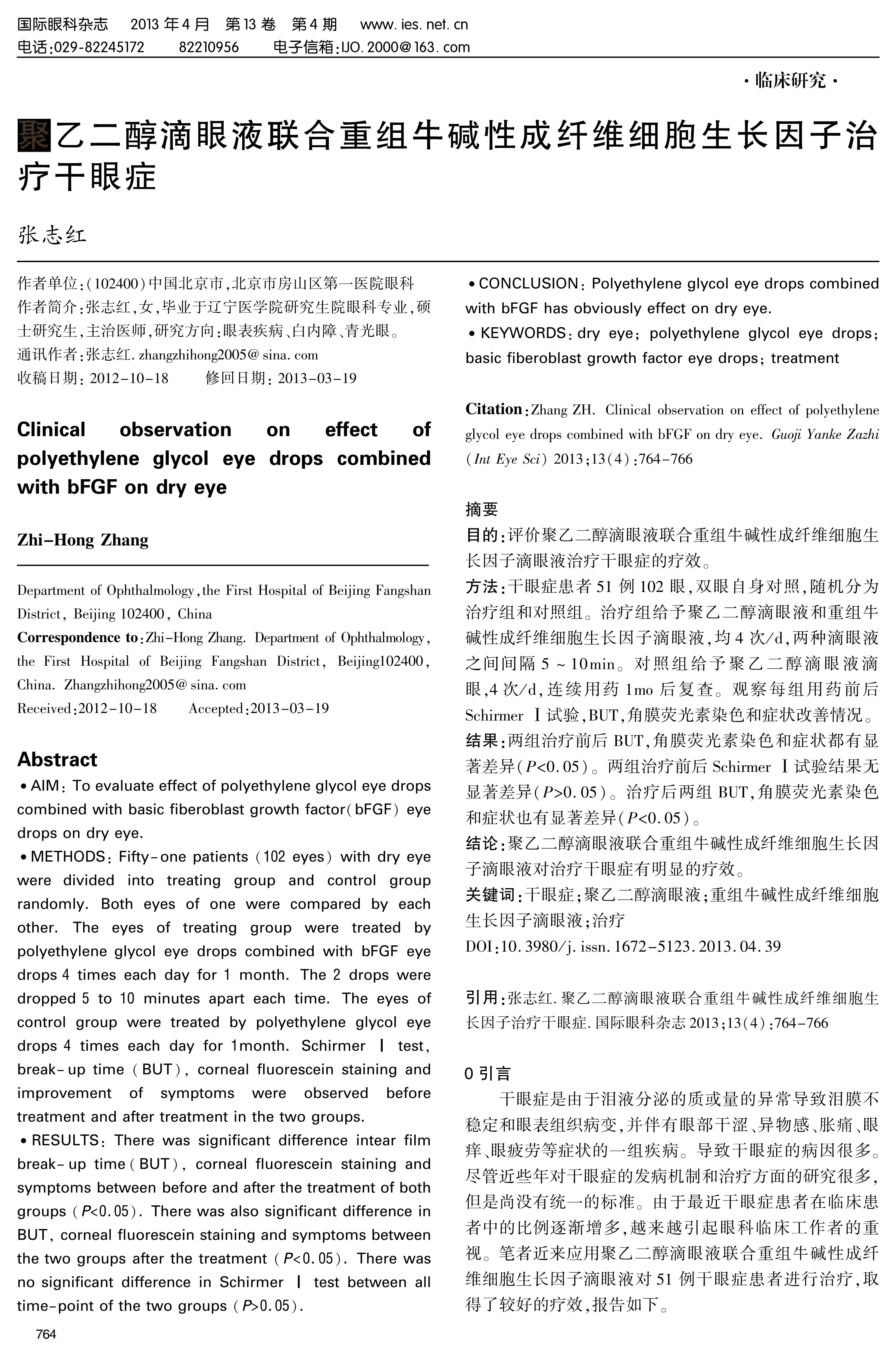 CONCLUSION: Polyethylene glycol eye drops combined with bFGF has obviously effect on dry eye.