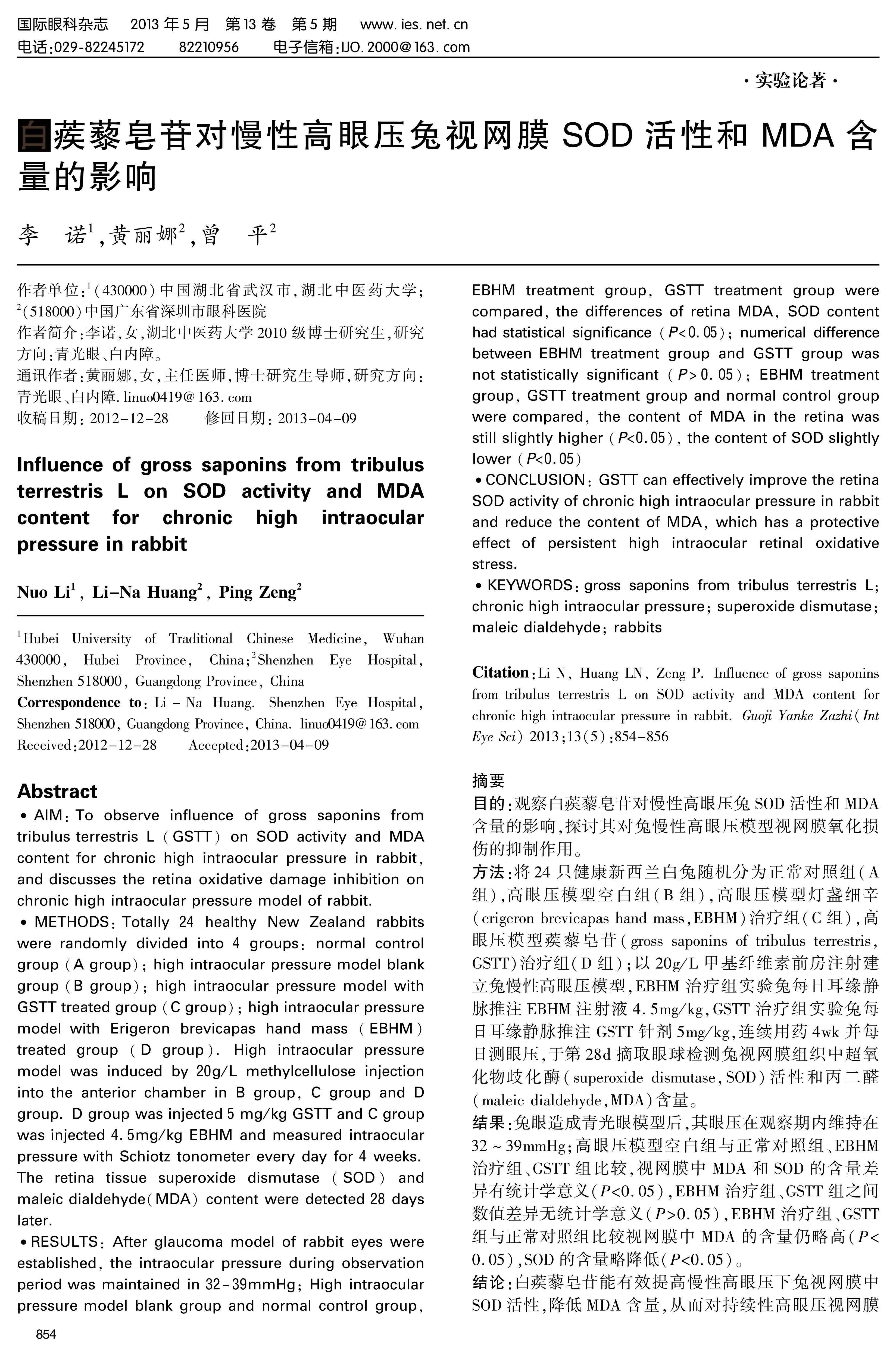 目的:观察白蒺藜皂苷对慢性高眼压兔SOD活性和MDA含量的影响,探讨其对兔慢性高眼压模型视网膜氧化损伤的抑制作用。