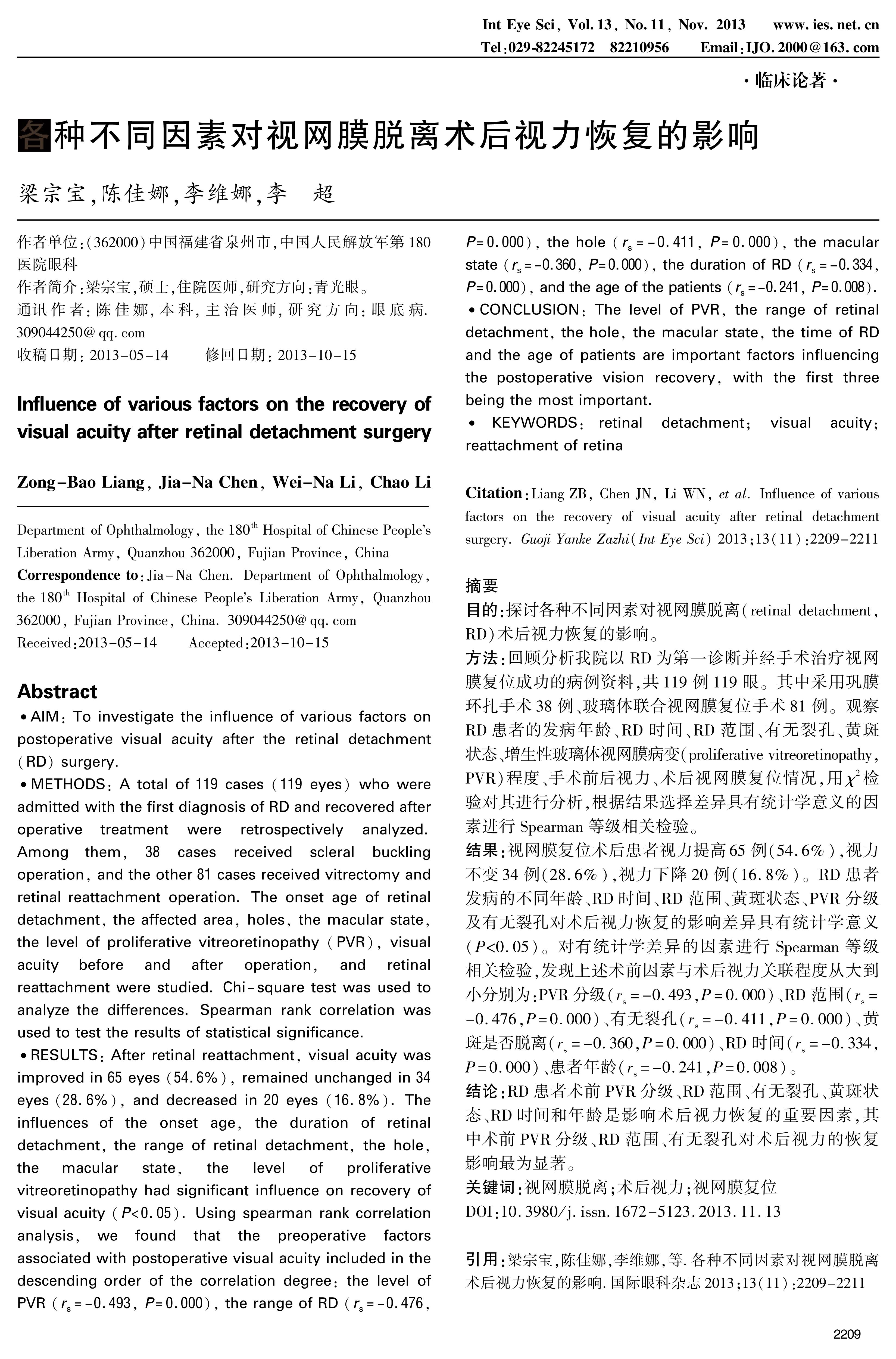 RESULTS: After retinal reattachment, visual acuity was improved in 65 eyes(54.6%), remained unchanged in 34 eyes(28.6%), and decreased in 20 eyes(16.8%). The influences of the onset age, the duration of retinal detachment, the range of retinal detachment, the hole, the macular state, the level of proliferative vitreoretinopathy had significant influence on recovery of visual acuity(P<0.05). Using spearman rank correlation analysis, we found that the preoperative factors associated with postoperative visual acuity included in the descending order of the correlation degree: the level of PVR(rs=-0.493, P=0.000), the range of RD(rs=-0.476, P=0.000), the hole(rs=-0.411, P=0.000), the macular state(rs=-0.360, P=0.000), the duration of RD(rs=-0.334, P=0.000), and the age of the patients(rs=-0.241, P=0.008).