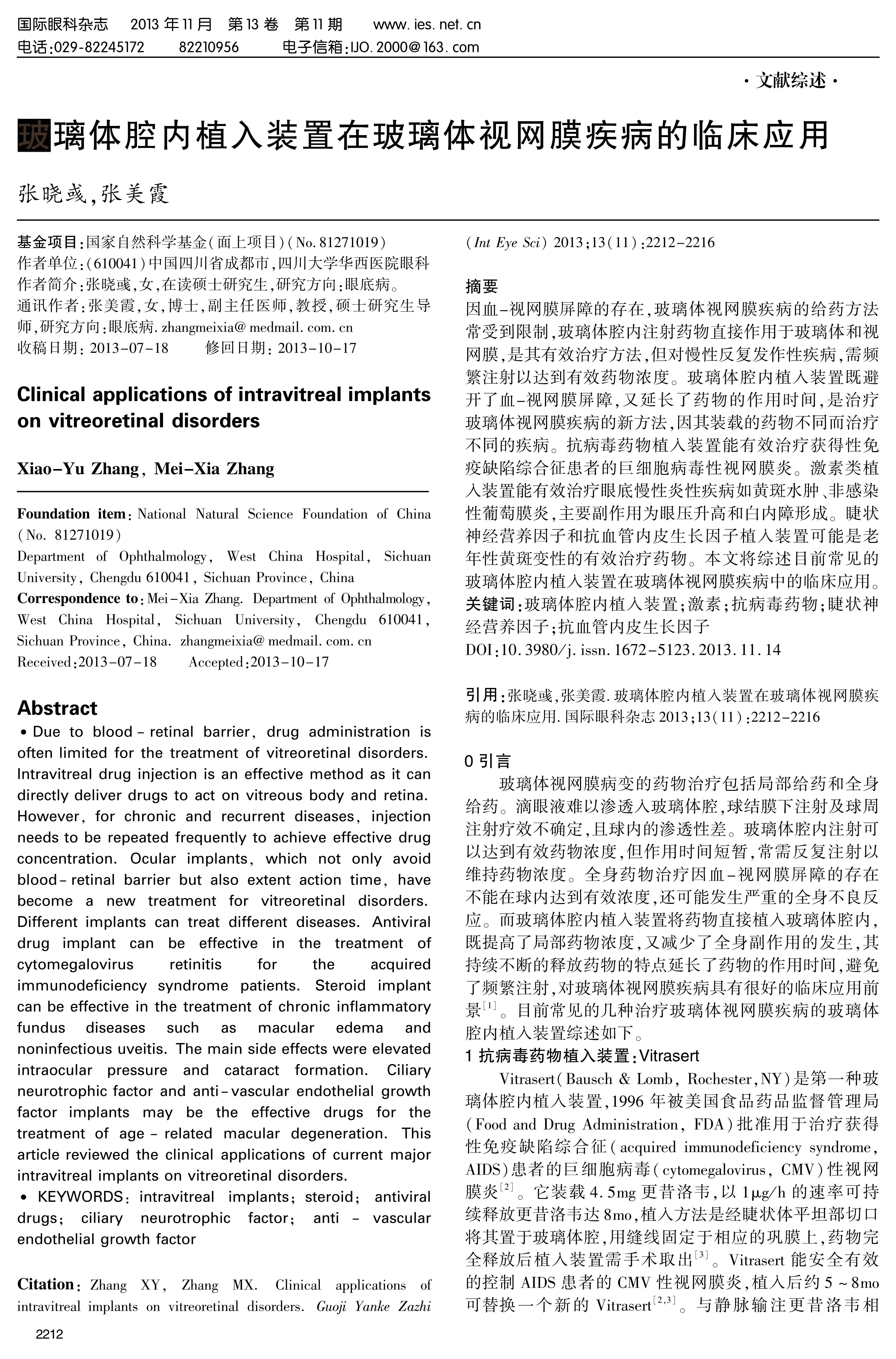 Due to blood-retinal barrier, drug administration is often limited for the treatment of vitreoretinal disorders. Intravitreal drug injection is an effective method as it can directly deliver drugs to act on vitreous body and retina. However, for chronic and recurrent diseases, injection needs to be repeated frequently to achieve effective drug concentration. Ocular implants, which not only avoid blood-retinal barrier but also extent action time, have become a new treatment for vitreoretinal disorders. Different implants can treat different diseases. Antiviral drug implant can be effective in the treatment of cytomegalovirus retinitis for the acquired immunodeficiency syndrome patients. Steroid implant can be effective in the treatment of chronic inflammatory fundus diseases such as macular edema and noninfectious uveitis. The main side effects were elevated intraocular pressure and cataract formation. Ciliary neurotrophic factor and anti-vascular endothelial growth factor implants may be the effective drugs for the treatment of age-related macular degeneration. This article reviewed the clinical applications of current major intravitreal implants on vitreoretinal disorders.