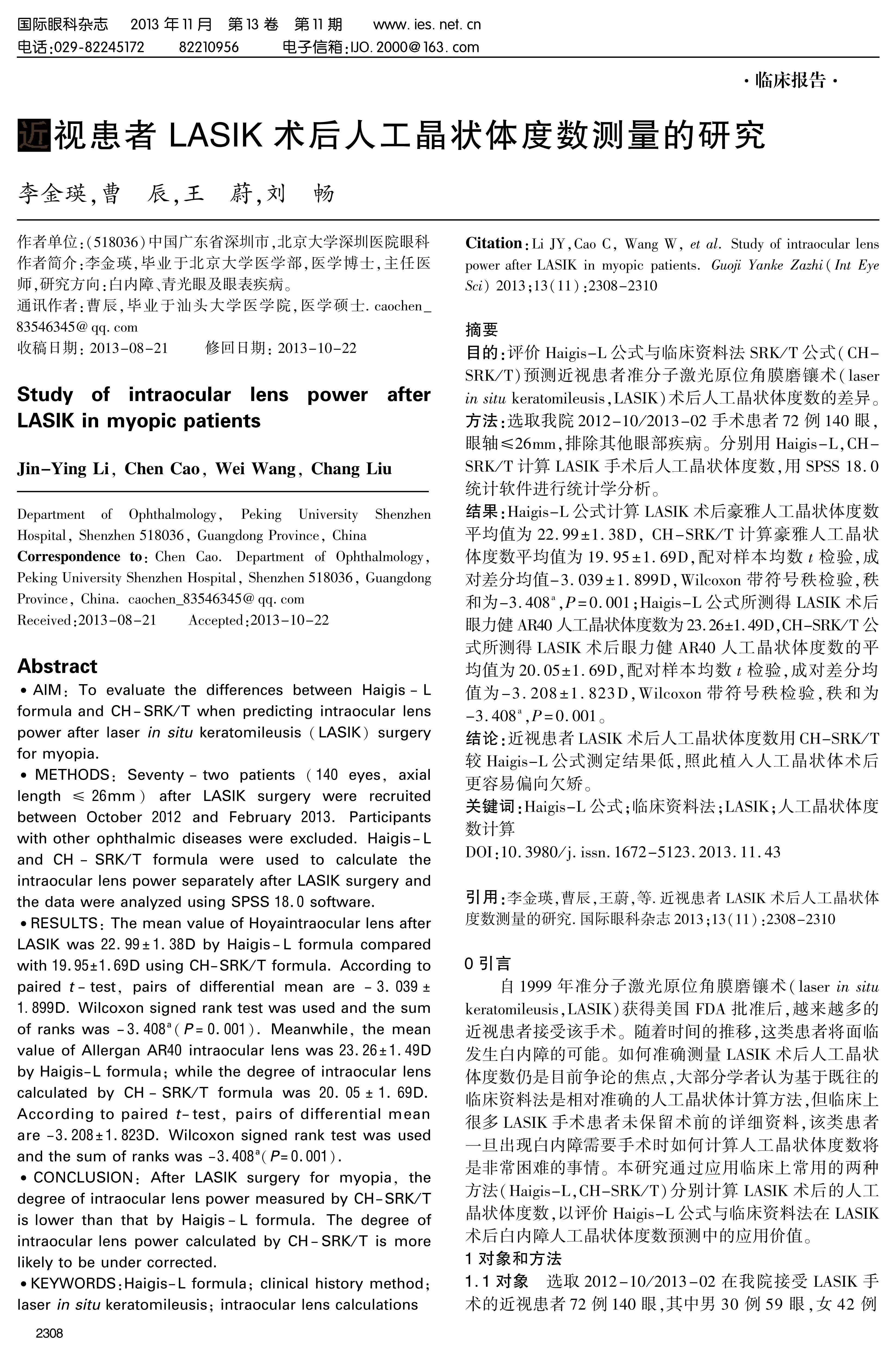 in situ keratomileusis,LASIK)术后人工晶状体度数的差异。