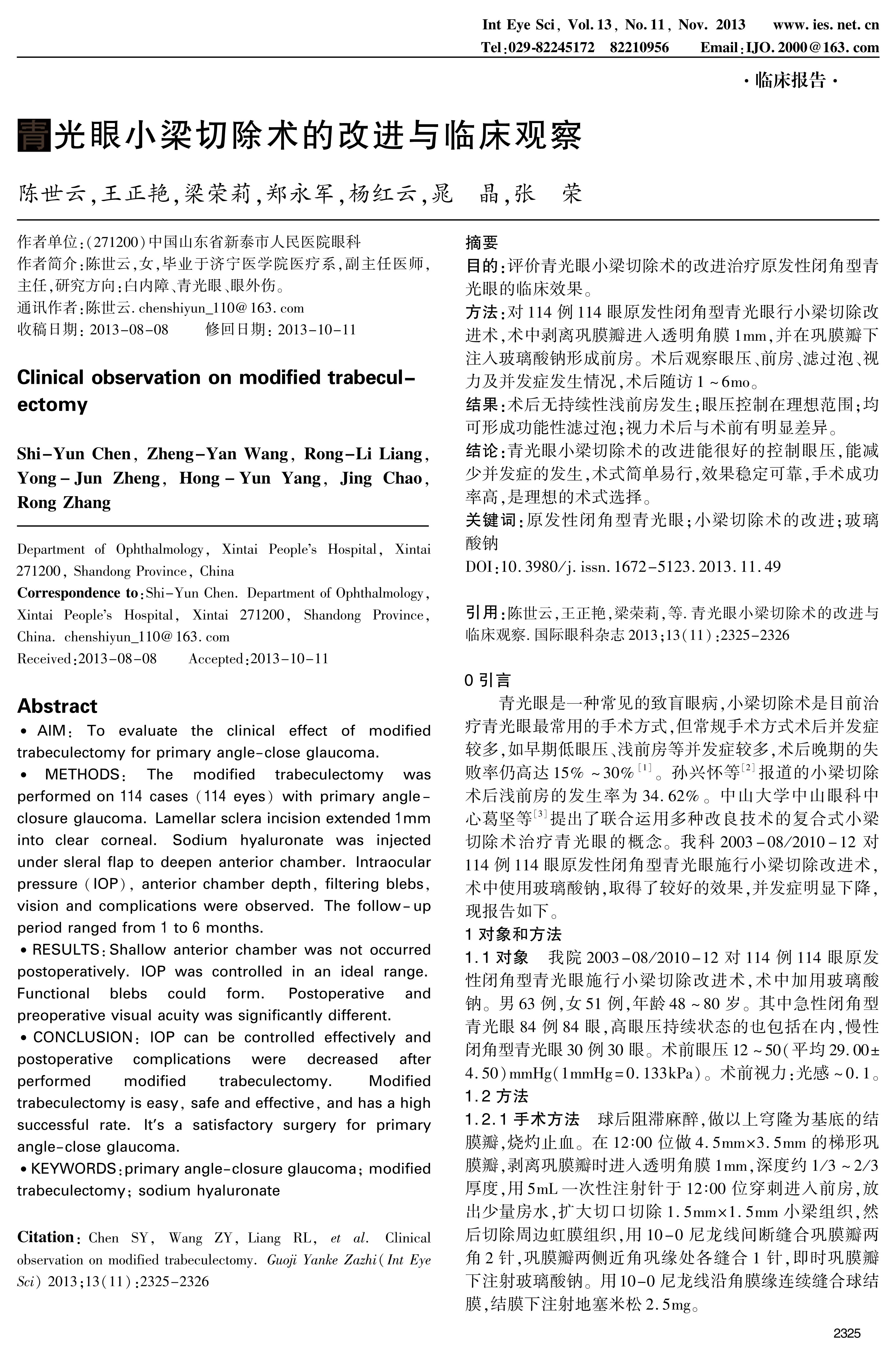 CONCLUSION: IOP can be controlled effectively and postoperative complications were decreased after performed modified trabeculectomy. Modified trabeculectomy is easy, safe and effective, and has a high successful rate. It's a satisfactory surgery for primary angle-close glaucoma.
