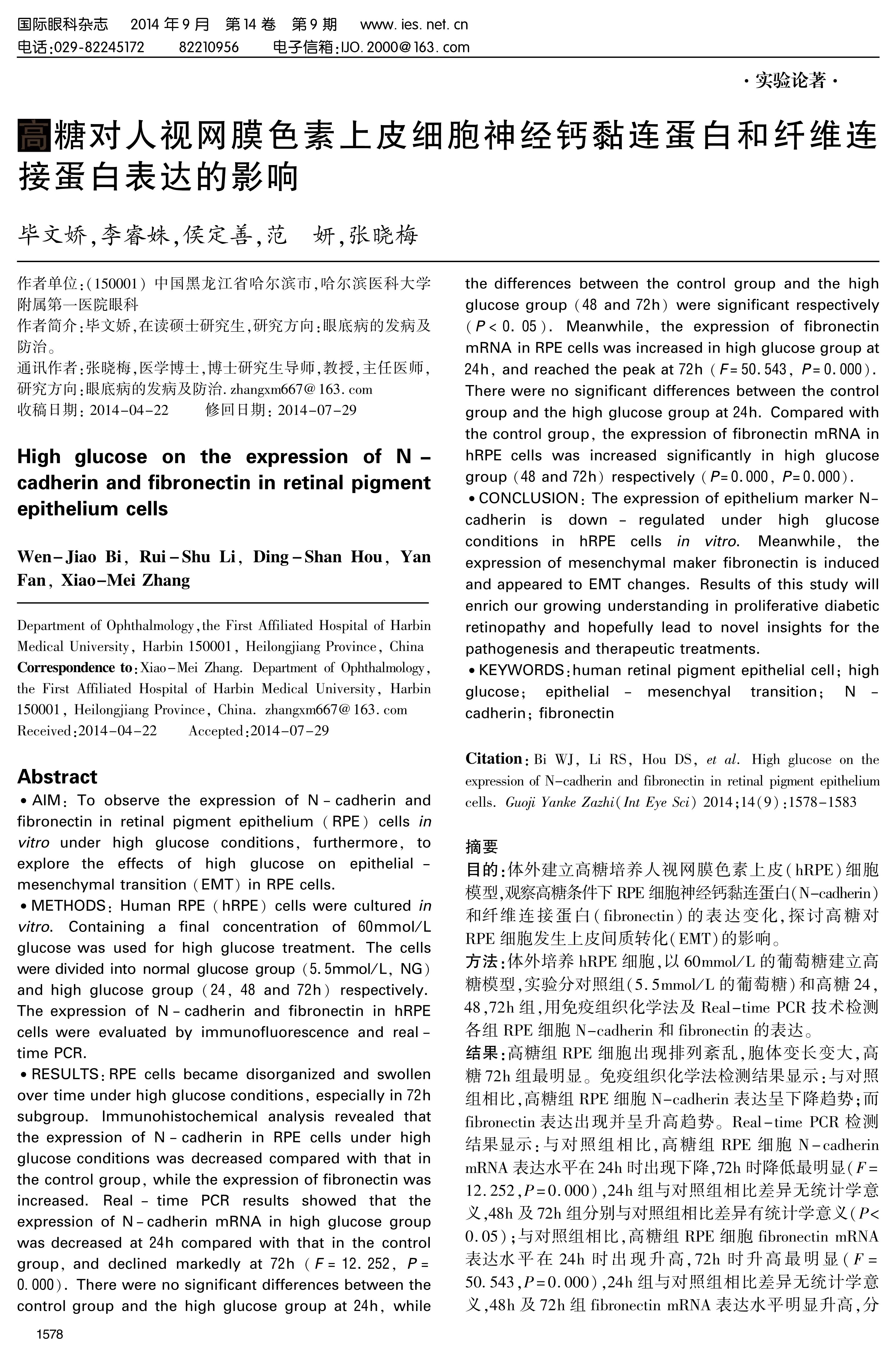 CONCLUSION: The expression of epithelium marker N-cadherin is down-regulated under high glucose conditions in hRPE cells in vitro. Meanwhile, the expression of mesenchymal maker fibronectin is induced and appeared to EMT changes. Results of this study will enrich our growing understanding in proliferative diabetic retinopathy and hopefully lead to novel insights for the pathogenesis and therapeutic treatments.