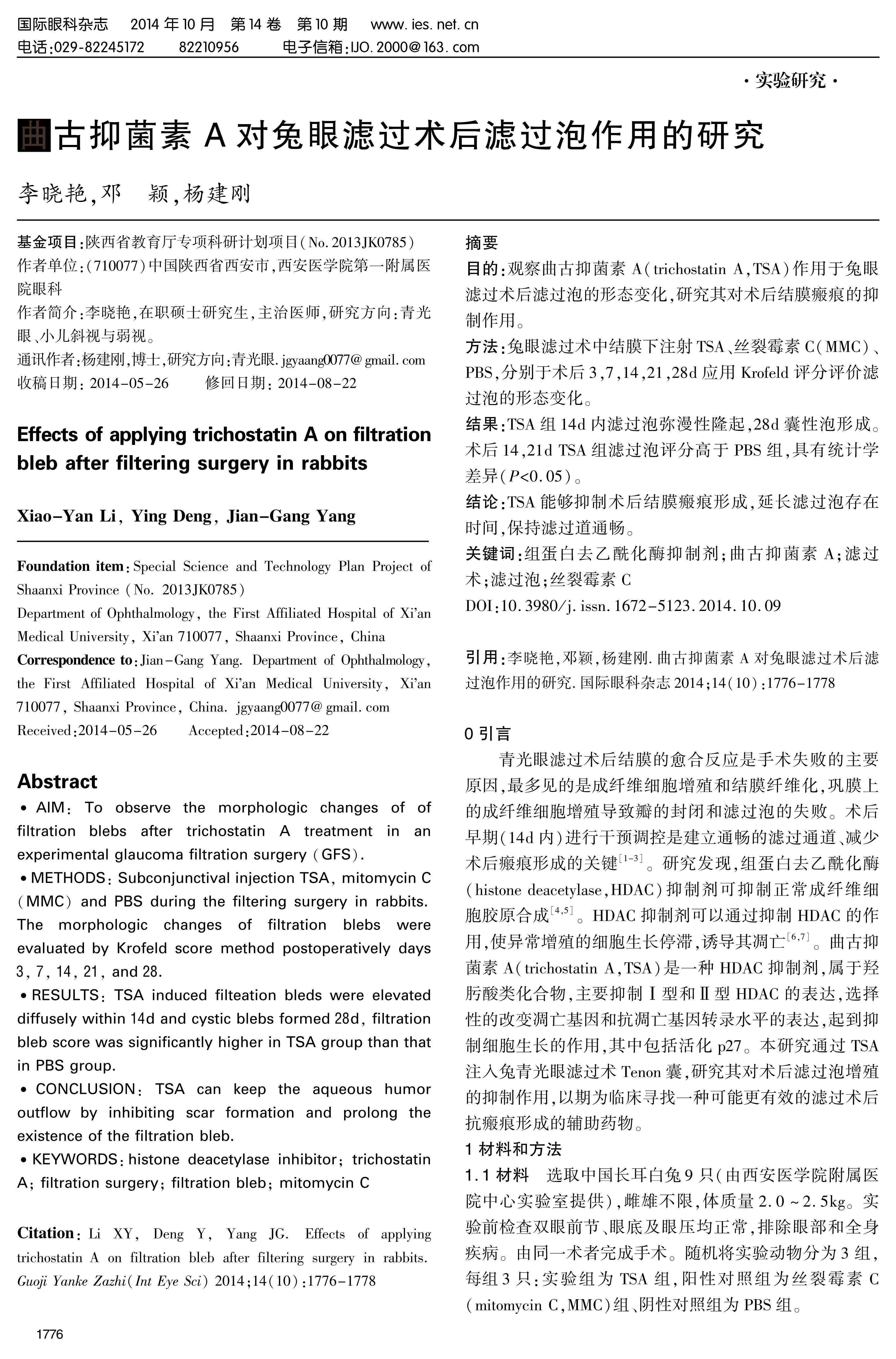 RESULTS: TSA induced filteation bleds were elevated diffusely within 14d and cystic blebs formed 28d, filtration bleb score was significantly higher in TSA group than that in PBS group.