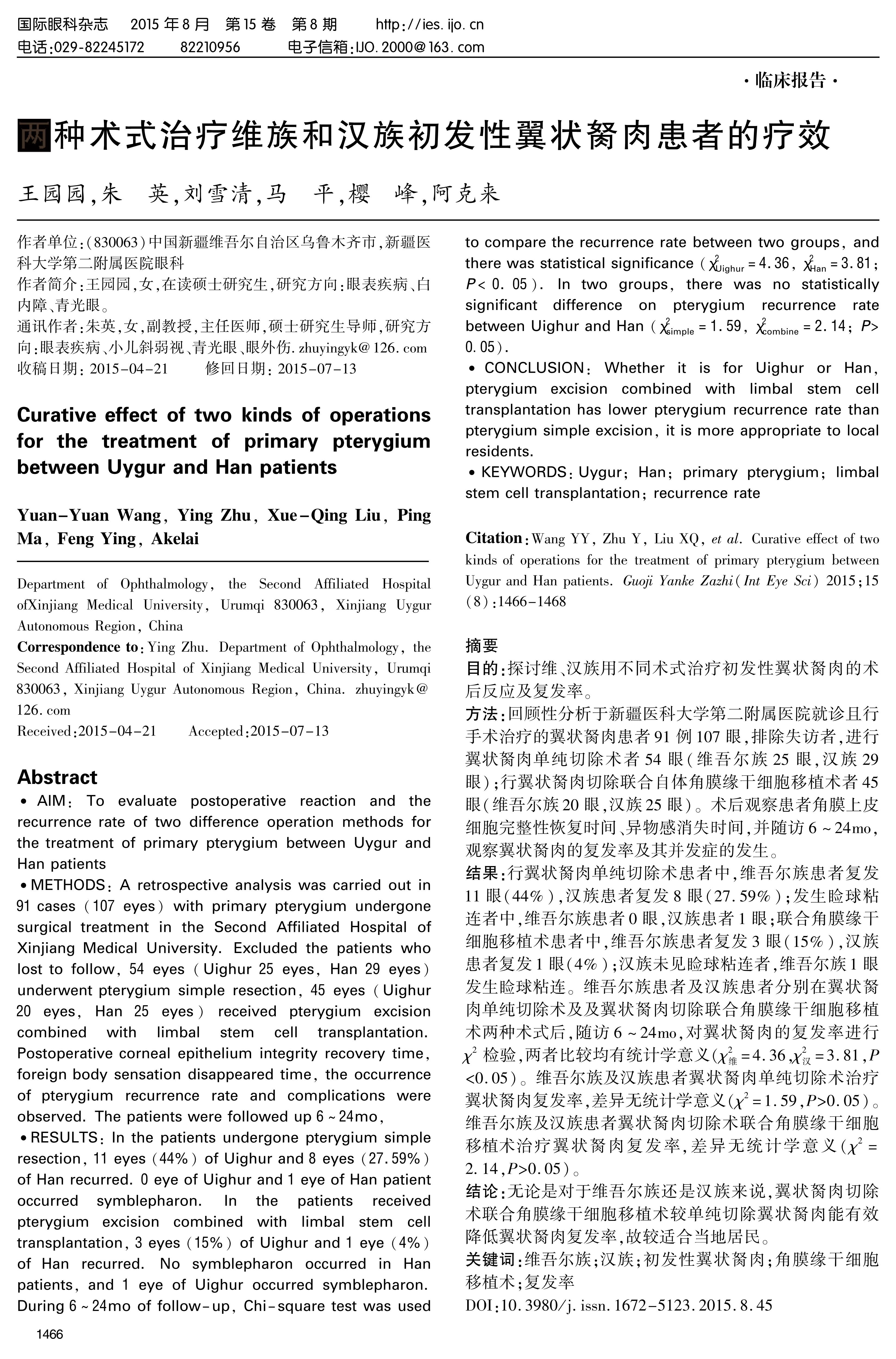 RESULTS: In the patients undergone pterygium simple resection, 11 eyes(44%)of Uighur and 8 eyes(27.59%)of Han recurred. 0 eye of Uighur and 1 eye of Han patient occurred symblepharon. In the patients received pterygium excision combined with limbal stem cell transplantation, 3 eyes(15%)of Uighur and 1 eye(4%)of Han recurred. No symblepharon occurred in Han patients, and 1 eye of Uighur occurred symblepharon.During 6~24mo of follow-up, Chi-square test was used to compare the recurrence rate between two groups, and there was statistical significance(χ2Uighur=4.36, χ2Han=3.81; P<0.05). In two groups, there was no statistically significant difference on pterygium recurrence rate between Uighur and Han(χ2simple=1.59, χ2combine=2.14; P>0.05).