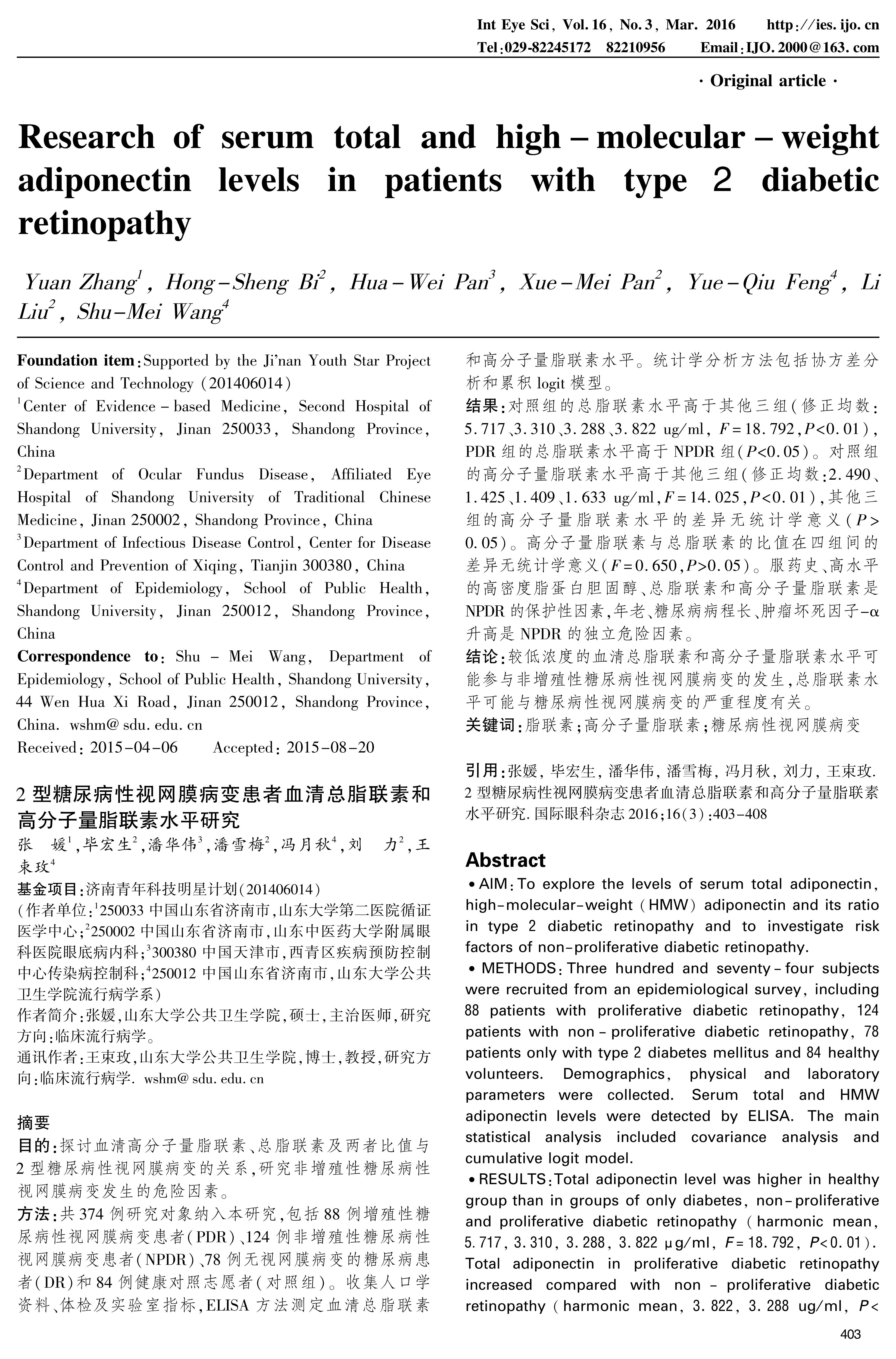 结论:较低浓度的血清总脂联素和高分子量脂联素水平可能参与非增殖性糖尿病性视网膜病变的发生,总脂联素水平可能与糖尿病性视网膜病变的严重程度有关。