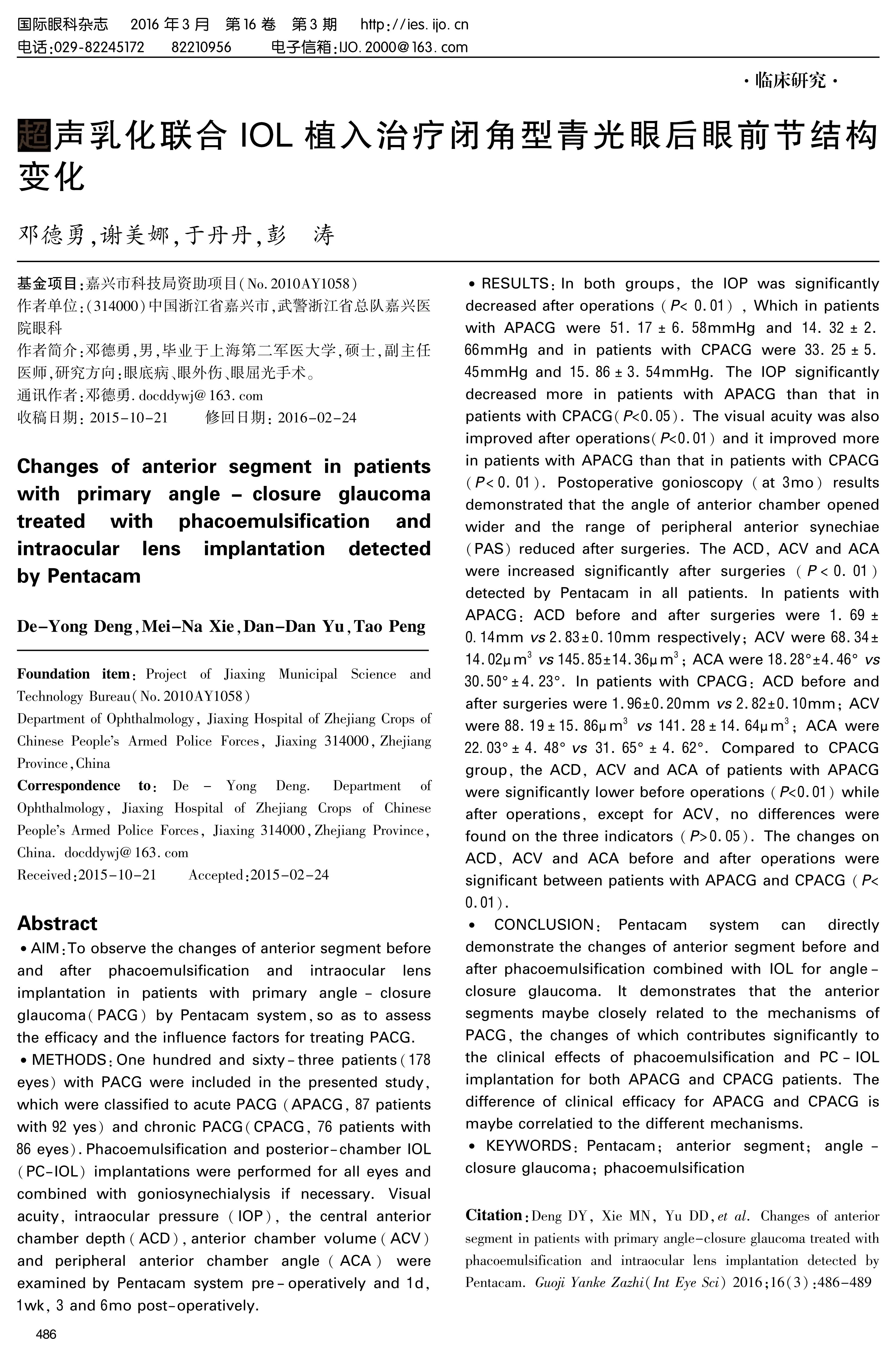 RESULTS:In both groups, the IOP was significantly decreased after operations(P< 0.01), Which in patients with APACG were 51.17±6.58mmHg and 14.32±2.66mmHg and in patients with CPACG were 33.25±5.45mmHg and 15.86±3.54mmHg. The IOP significantly decreased more in patients with APACG than that in patients with CPACG(P<0.05). The visual acuity was also improved after operations(P<0.01)and it improved more in patients with APACG than that in patients with CPACG(P<0.01). Postoperative gonioscopy(at 3mo)results demonstrated that the angle of anterior chamber opened wider and the range of peripheral anterior synechiae(PAS)reduced after surgeries. The ACD, ACV and ACA were increased significantly after surgeries(P<0.01)detected by Pentacam in all patients. In patients with APACG: ACD before and after surgeries were 1.69±0.14mm vs 2.83±0.10mm respectively; ACV were 68.34±14.02μm3 vs 145.85±14.36μm3; ACA were 18.28°±4.46° vs 30.50°±4.23°. In patients with CPACG: ACD before and after surgeries were 1.96±0.20mm vs 2.82±0.10mm; ACV were 88.19±15.86μm3 vs 141.28±14.64μm3; ACA were 22.03°±4.48°vs 31.65°±4.62°. Compared to CPACG group, the ACD, ACV and ACA of patients with APACG were significantly lower before operations(P<0.01)while after operations, except for ACV, no differences were found on the three indicators(P>0.05). The changes on ACD, ACV and ACA before and after operations were significant between patients with APACG and CPACG(P<0.01).