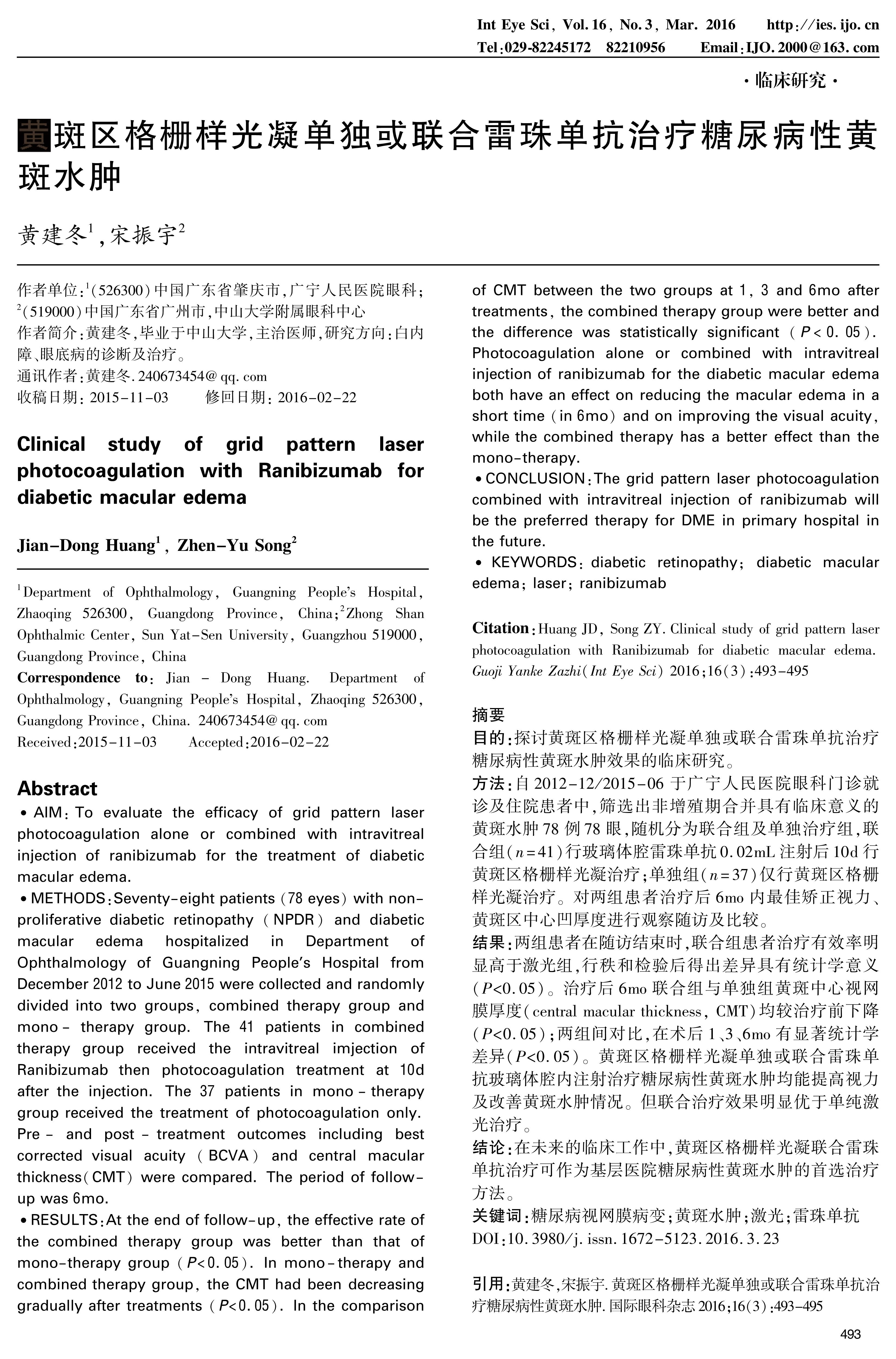 RESULTS:At the end of follow-up, the effective rate of the combined therapy group was better than that of mono-therapy group(P<0.05). In mono-therapy and combined therapy group, the CMT had been decreasing gradually after treatments(P<0.05). In the comparison of CMT between the two groups at 1, 3 and 6mo after treatments, the combined therapy group were better and the difference was statistically significant(P<0.05). Photocoagulation alone or combined with intravitreal injection of ranibizumab for the diabetic macular edema both have an effect on reducing the macular edema in a short time(in 6mo)and on improving the visual acuity, while the combined therapy has a better effect than the mono-therapy.