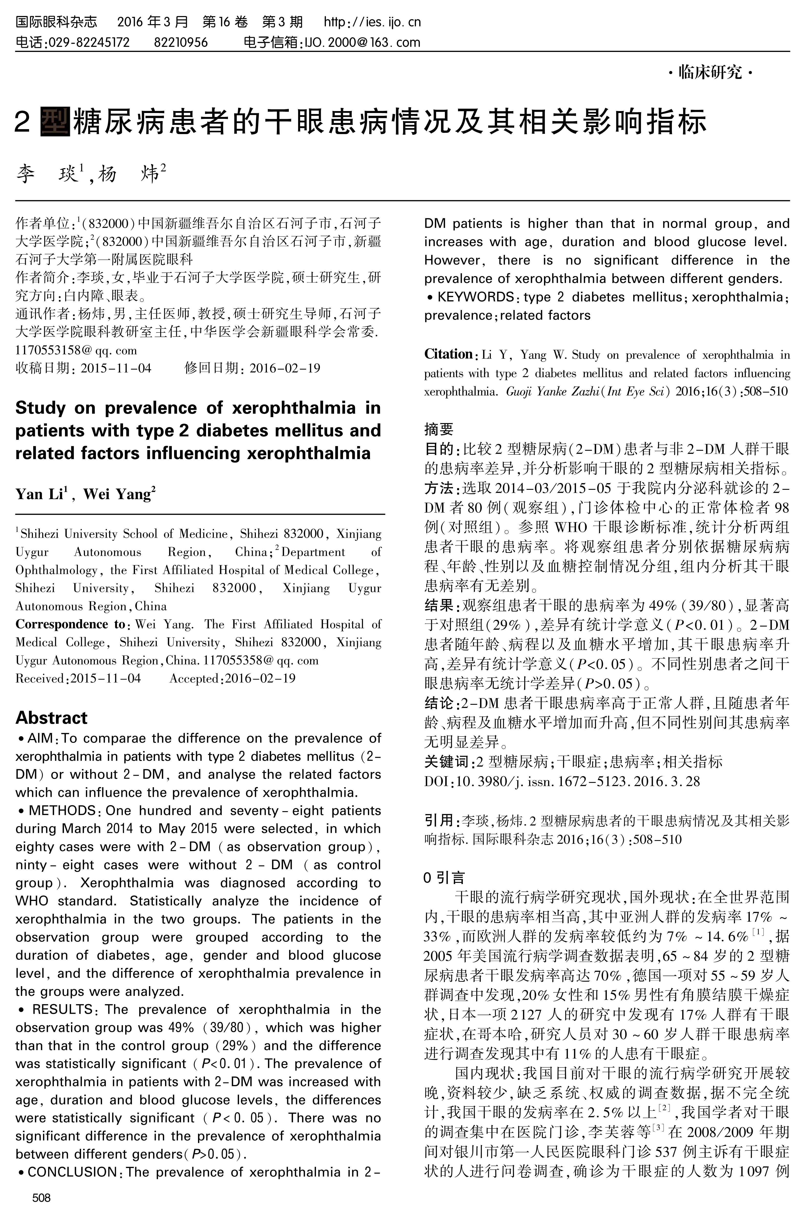 CONCLUSION:The prevalence of xerophthalmia in 2-DM patients is higher than that in normal group, and increases with age, duration and blood glucose level. However, there is no significant difference in the prevalence of xerophthalmia between different genders.
