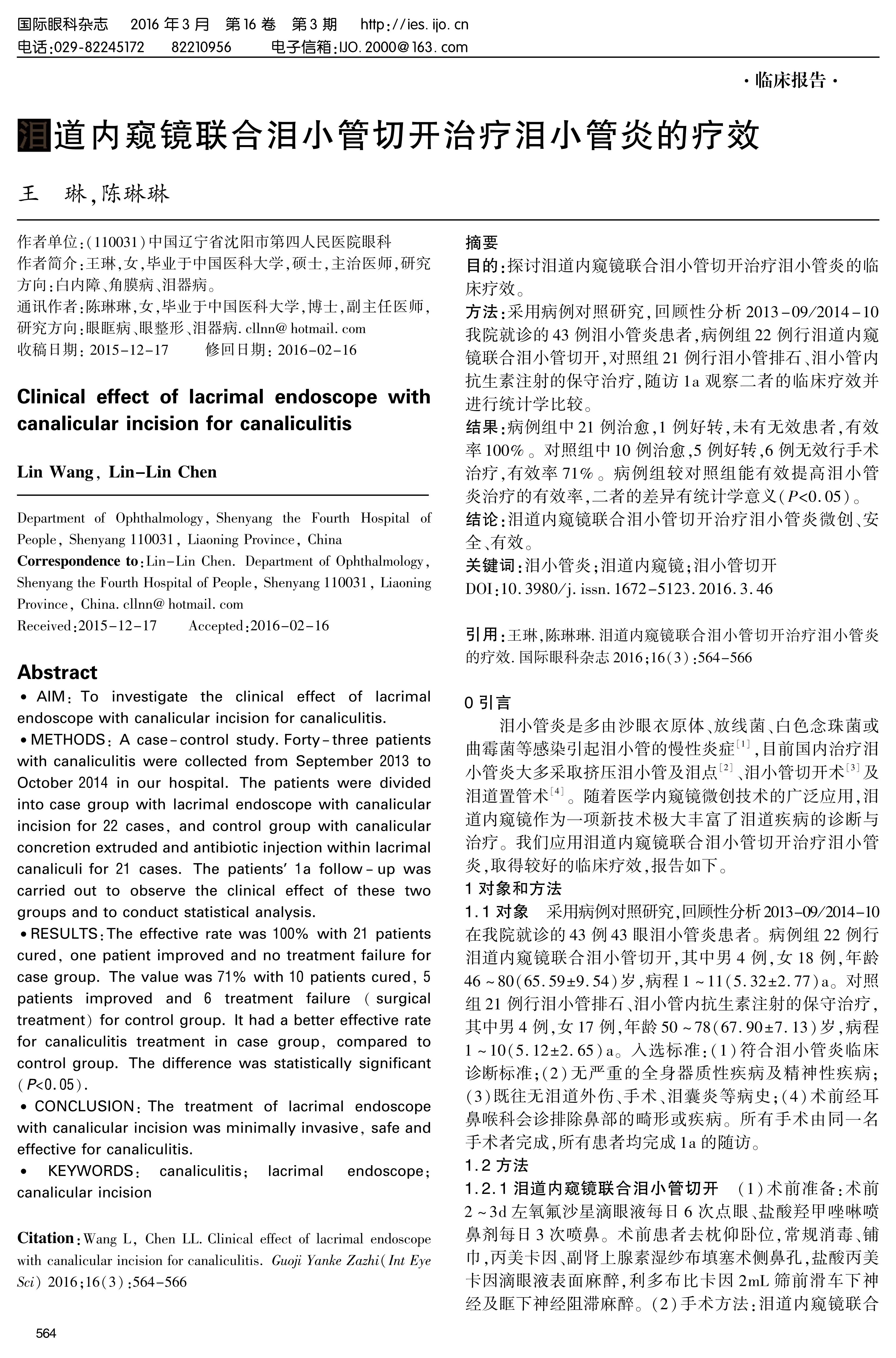 METHODS: A case-control study.Forty-three patients with canaliculitis were collected from September 2013 to October 2014 in our hospital. The patients were divided into case group with lacrimal endoscope with canalicular incision for 22 cases, and control group with canalicular concretion extruded and antibiotic injection within lacrimal canaliculi for 21 cases. The patients' 1a follow-up was carried out to observe the clinical effect of these two groups and to conduct statistical analysis.