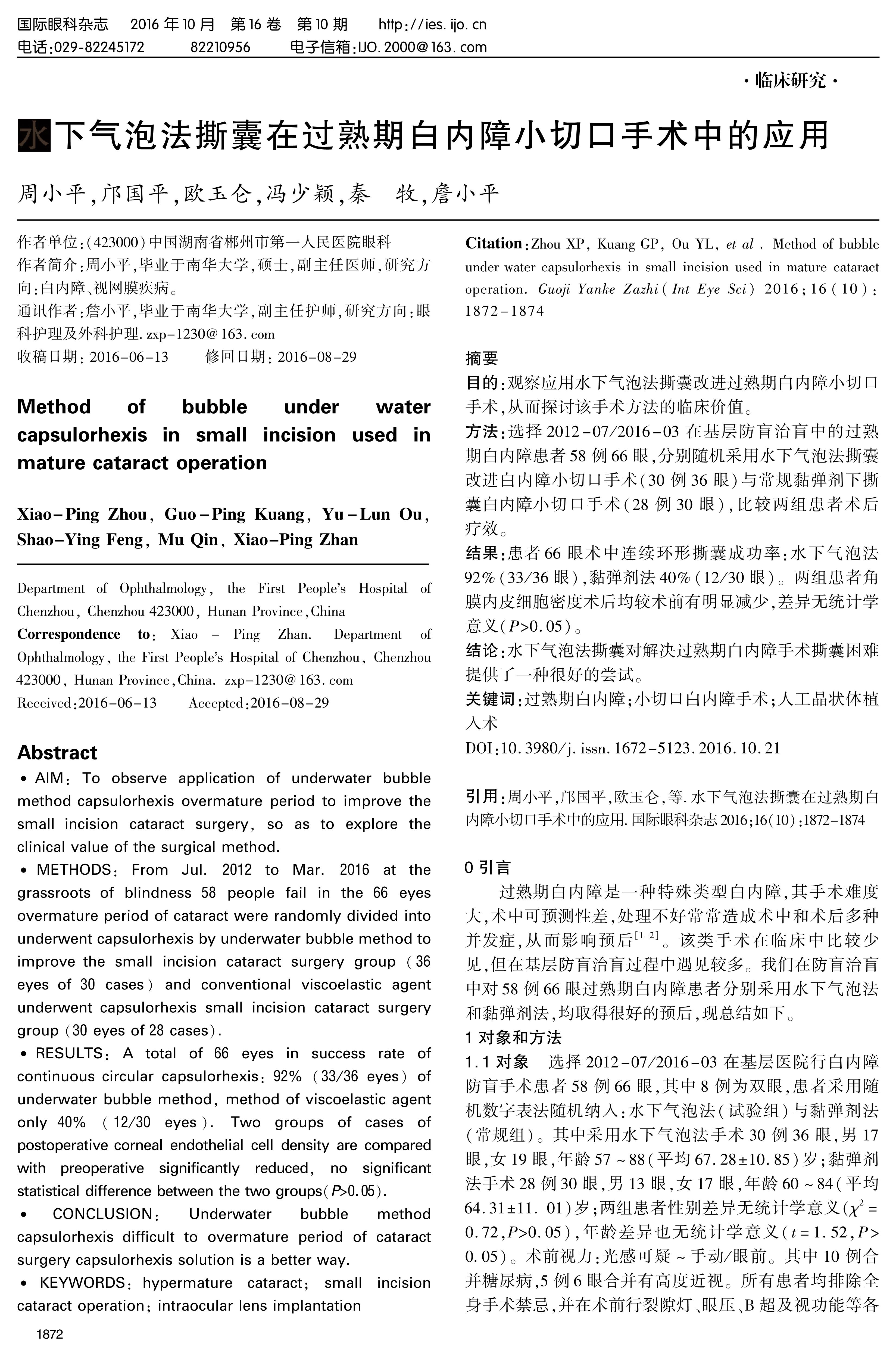 METHODS: From Jul. 2012 to Mar. 2016 at the grassroots of blindness 58 people fail in the 66 eyes overmature period of cataract were randomly divided into underwent capsulorhexis by underwater bubble method to improve the small incision cataract surgery group(36 eyes of 30 cases)and conventional viscoelastic agent underwent capsulorhexis small incision cataract surgery group(30 eyes of 28 cases).