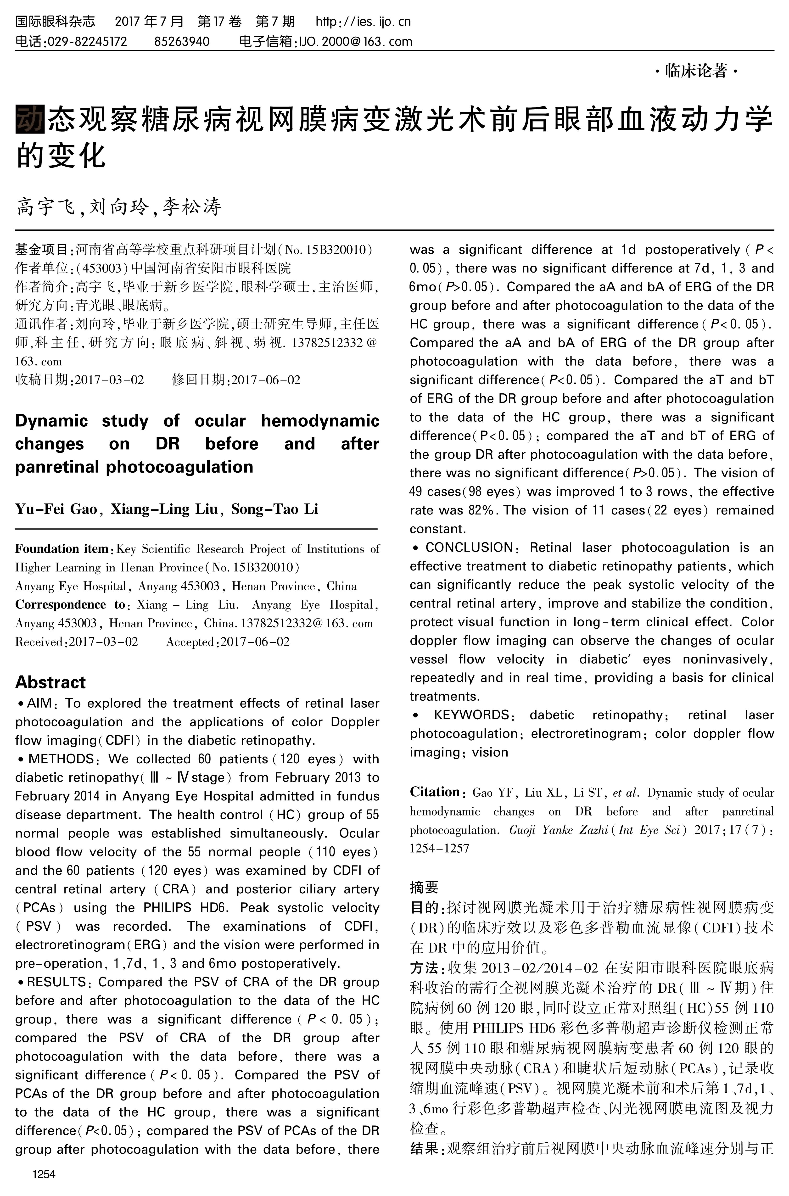 方法:收集2013-02/2014-02在安阳市眼科医院眼底病科收治的需行全视网膜光凝术治疗的DR(Ⅲ~Ⅳ期)住院病例60例120眼,同时设立正常对照组(HC)55例110眼。使用PHILIPS HD6彩色多普勒超声诊断仪检测正常人55例110眼和糖尿病视网膜病变患者60例120眼的视网膜中央动脉(CRA)和睫状后短动脉(PCAs),记录收缩期血流峰速(PSV)。视网膜光凝术前和术后第1、7d,1、3、6mo行彩色多普勒超声检查、闪光视网膜电流图及视力检查。