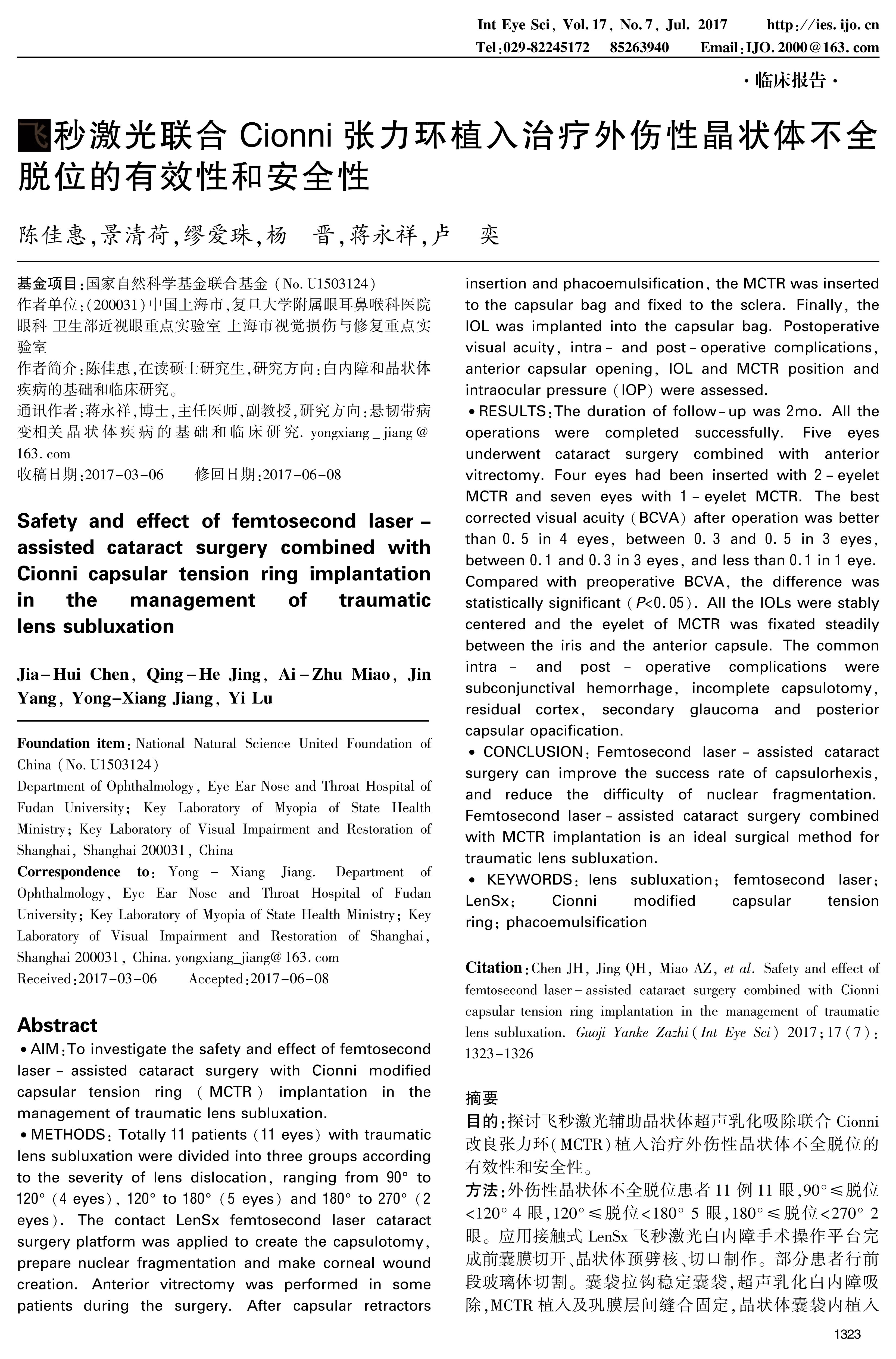 目的:探讨飞秒激光辅助晶状体超声乳化吸除联合Cionni 改良张力环(MCTR)植入治疗外伤性晶状体不全脱位的有效性和安全性。