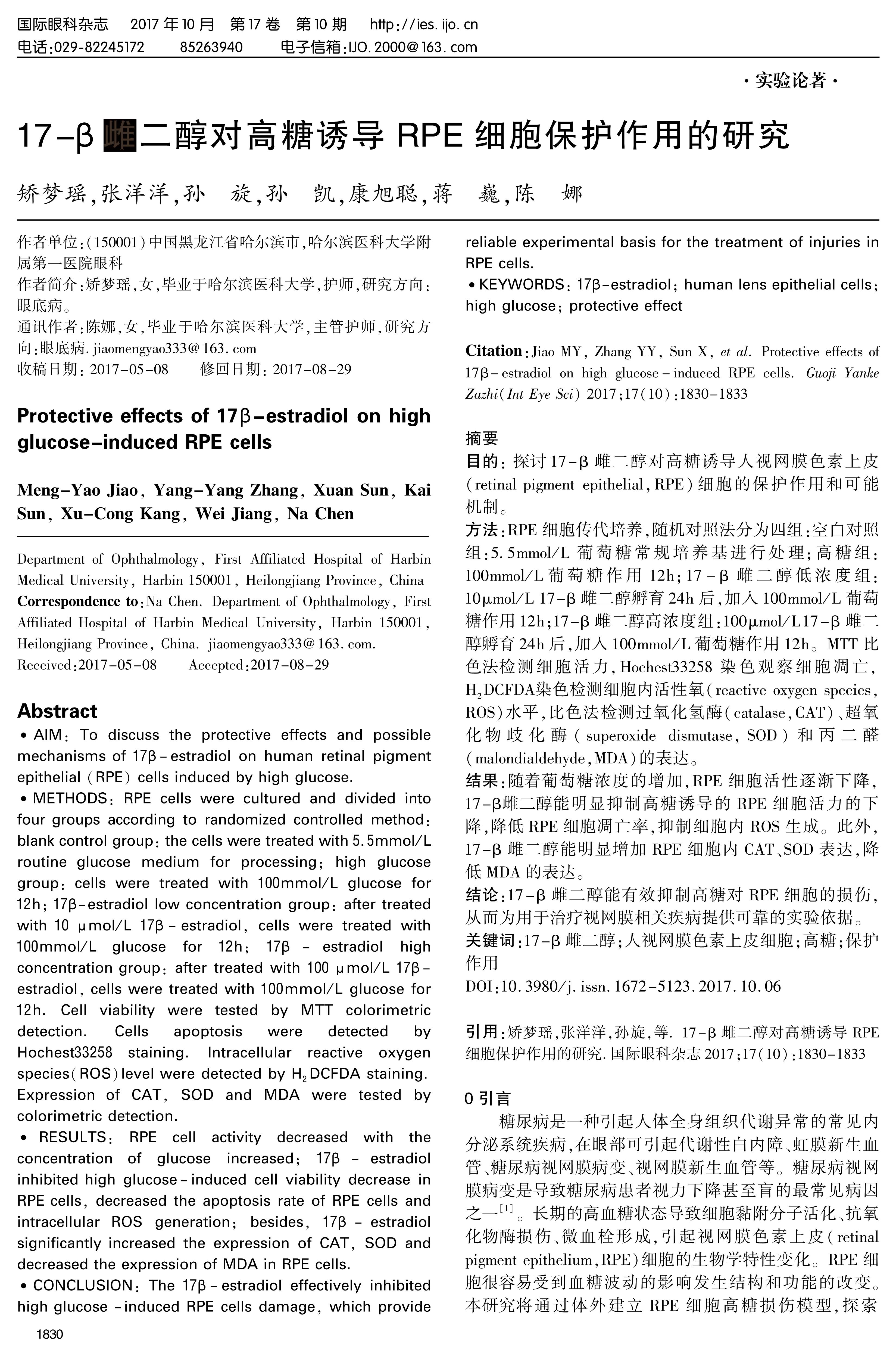 RESULTS: RPE cell activity decreased with the concentration of glucose increased; 17β-estradiol inhibited high glucose-induced cell viability decrease in RPE cells, decreased the apoptosis rate of RPE cells and intracellular ROS generation; besides, 17β-estradiol significantly increased the expression of CAT, SOD and decreased the expression of MDA in RPE cells.