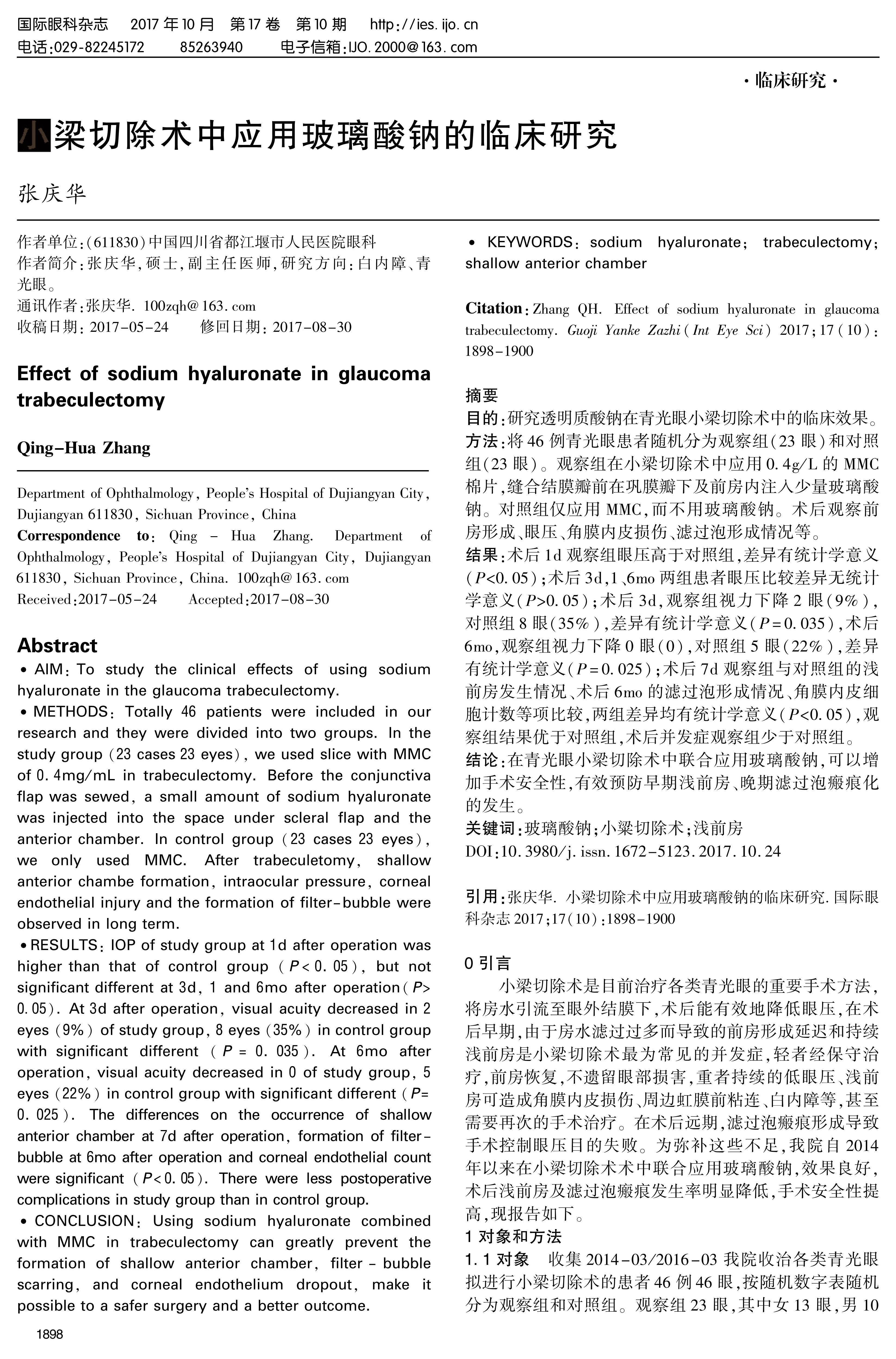 结论:在青光眼小梁切除术中联合应用玻璃酸钠,可以增加手术安全性,有效预防早期浅前房、晚期滤过泡瘢痕化的发生。