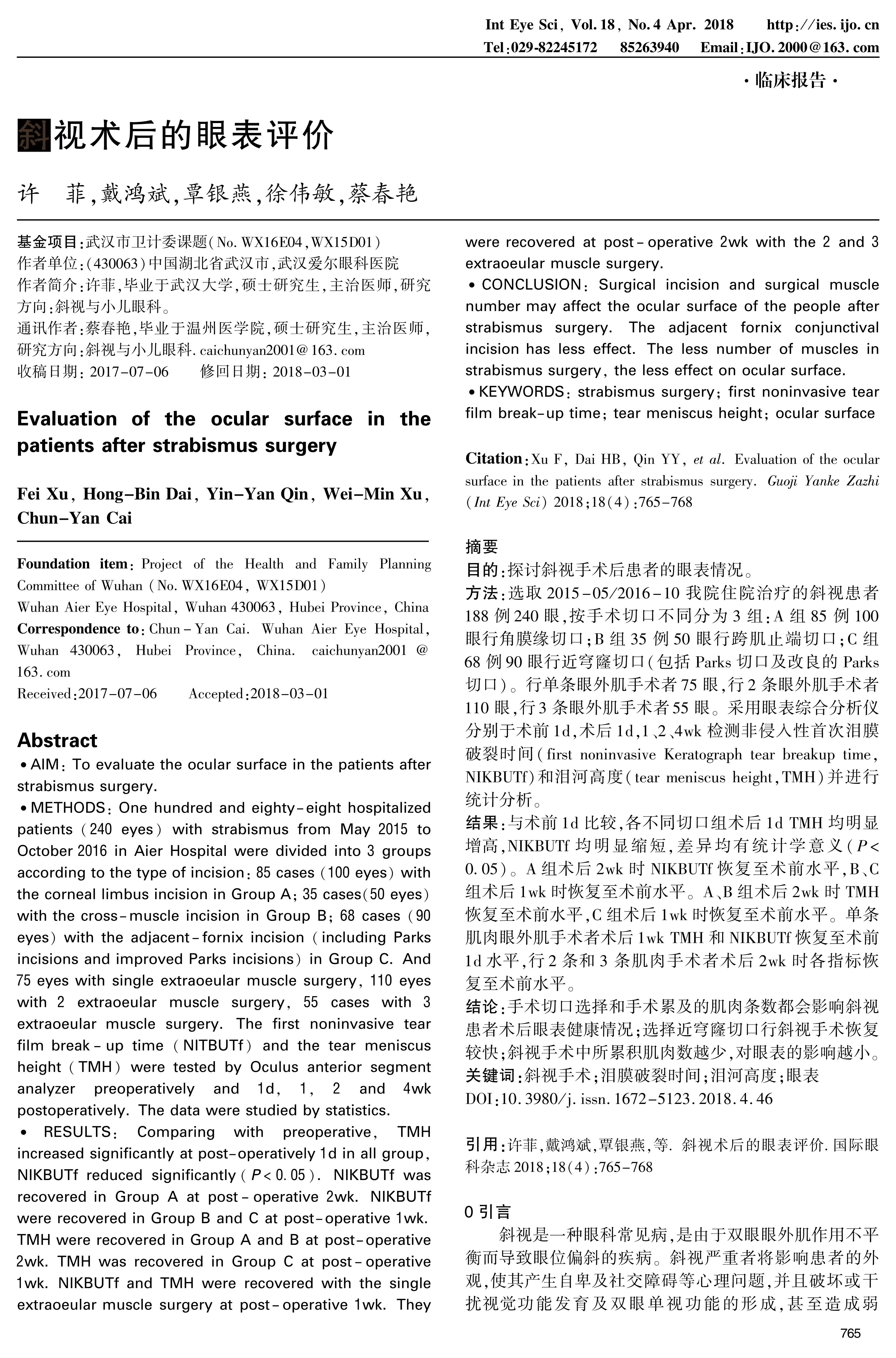 CONCLUSION: Surgical incision and surgical muscle number may affect the ocular surface of the people after strabismus surgery. The adjacent fornix conjunctival incision has less effect. The less number of muscles in strabismus surgery, the less effect on ocular surface.