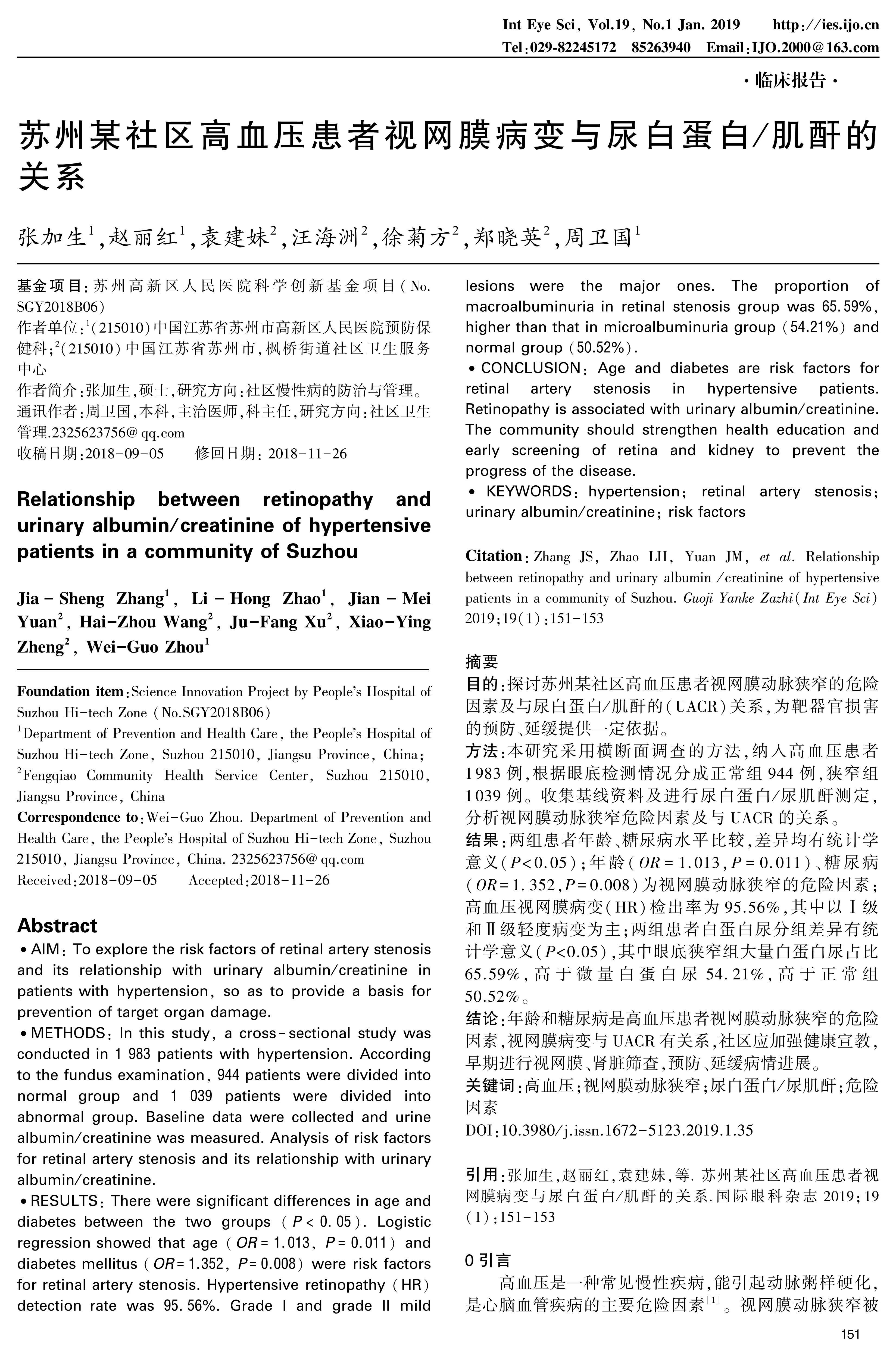 METHODS: In this study, a cross-sectional study was conducted in 1 983 patients with hypertension. According to the fundus examination, 944 patients were divided into normal group and 1 039 patients were divided into abnormal group. Baseline data were collected and urine albumin/creatinine was measured. Analysis of risk factors for retinal artery stenosis and its relationship with urinary albumin/creatinine.