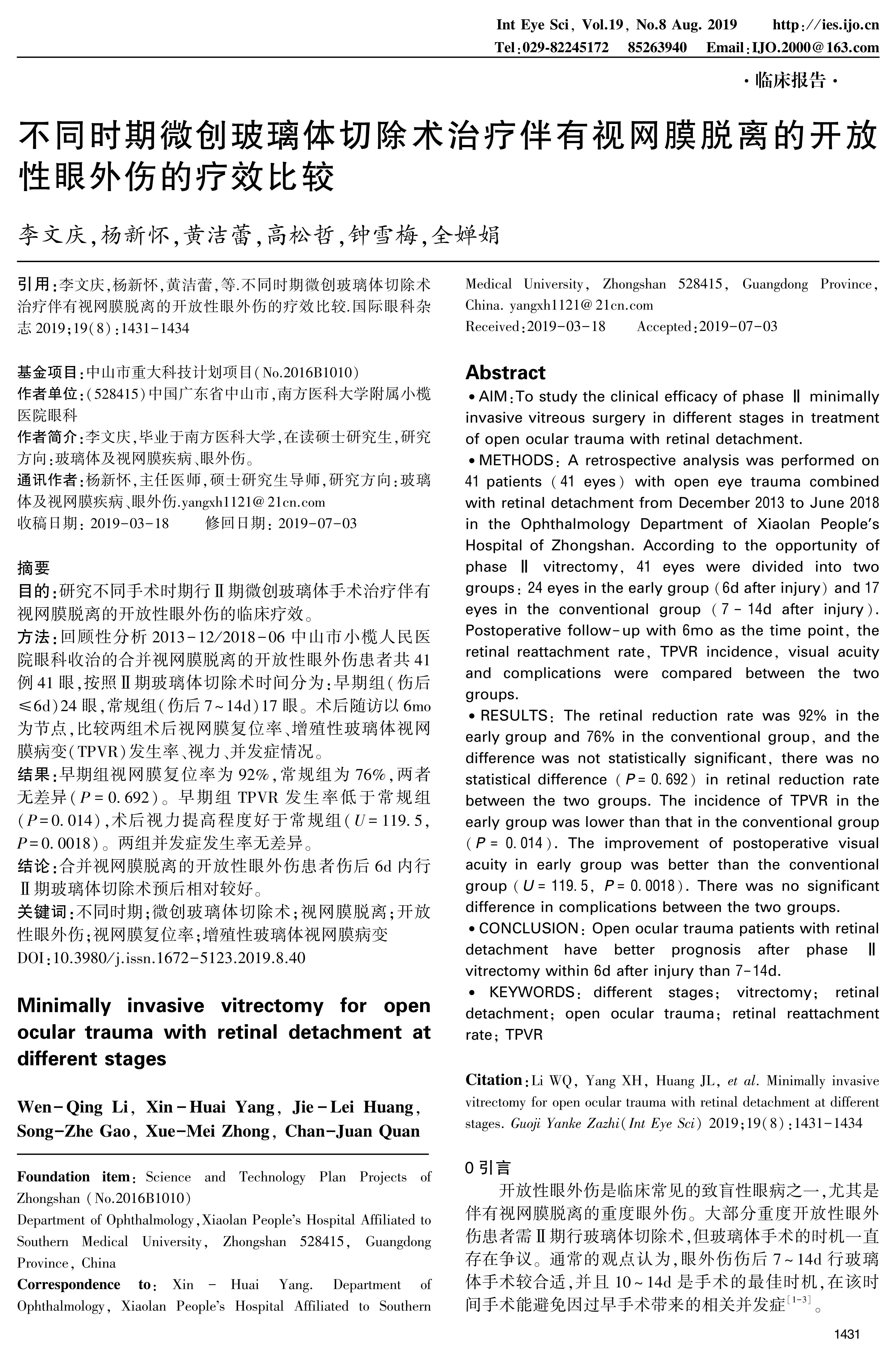 AIM:To study the clinical efficacy of phase Ⅱ minimally invasive vitreous surgery in different stages in treatment of open ocular trauma with retinal detachment.