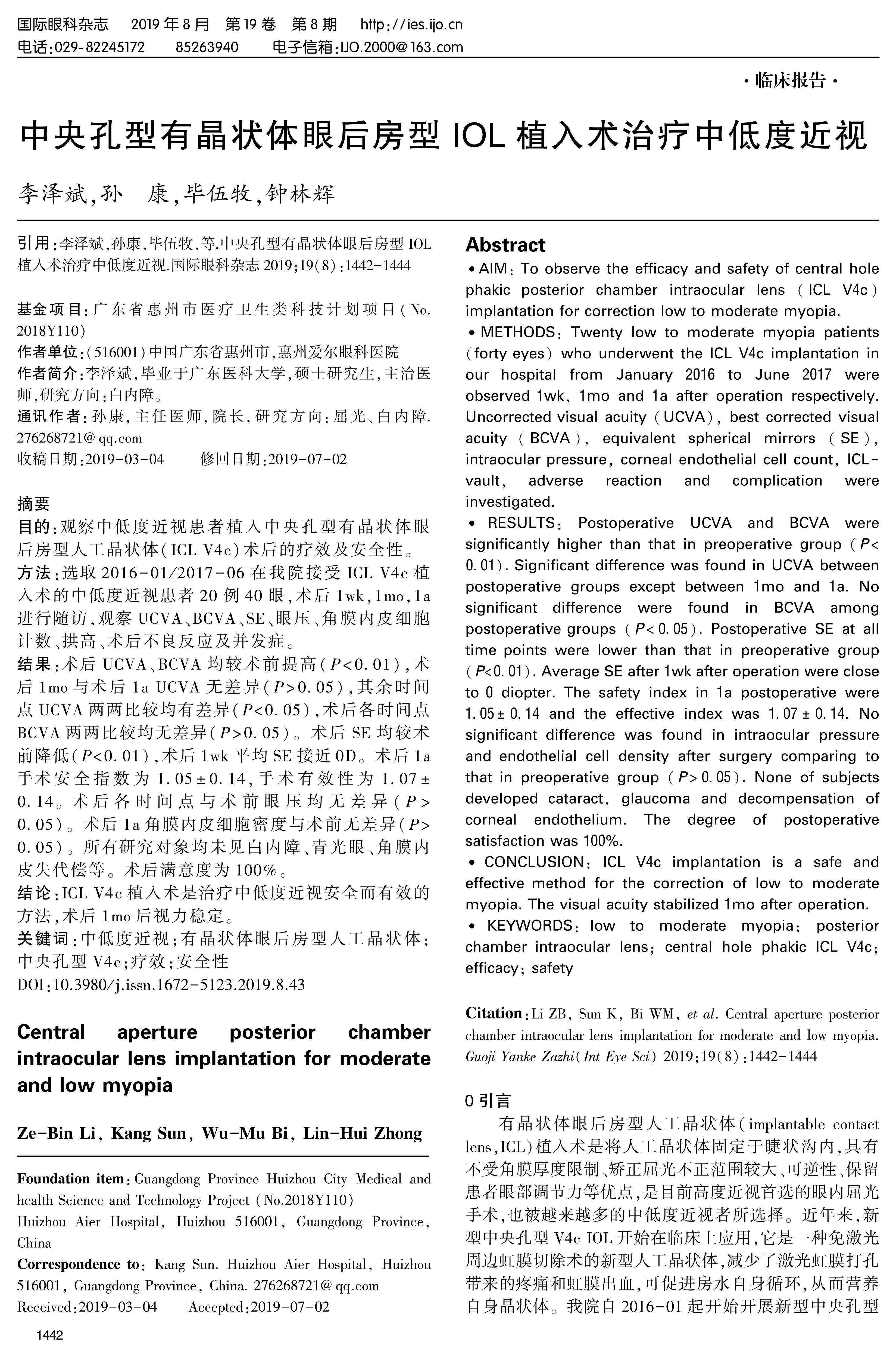 目的:观察中低度近视患者植入中央孔型有晶状体眼后房型人工晶状体(ICL V4c)术后的疗效及安全性。
