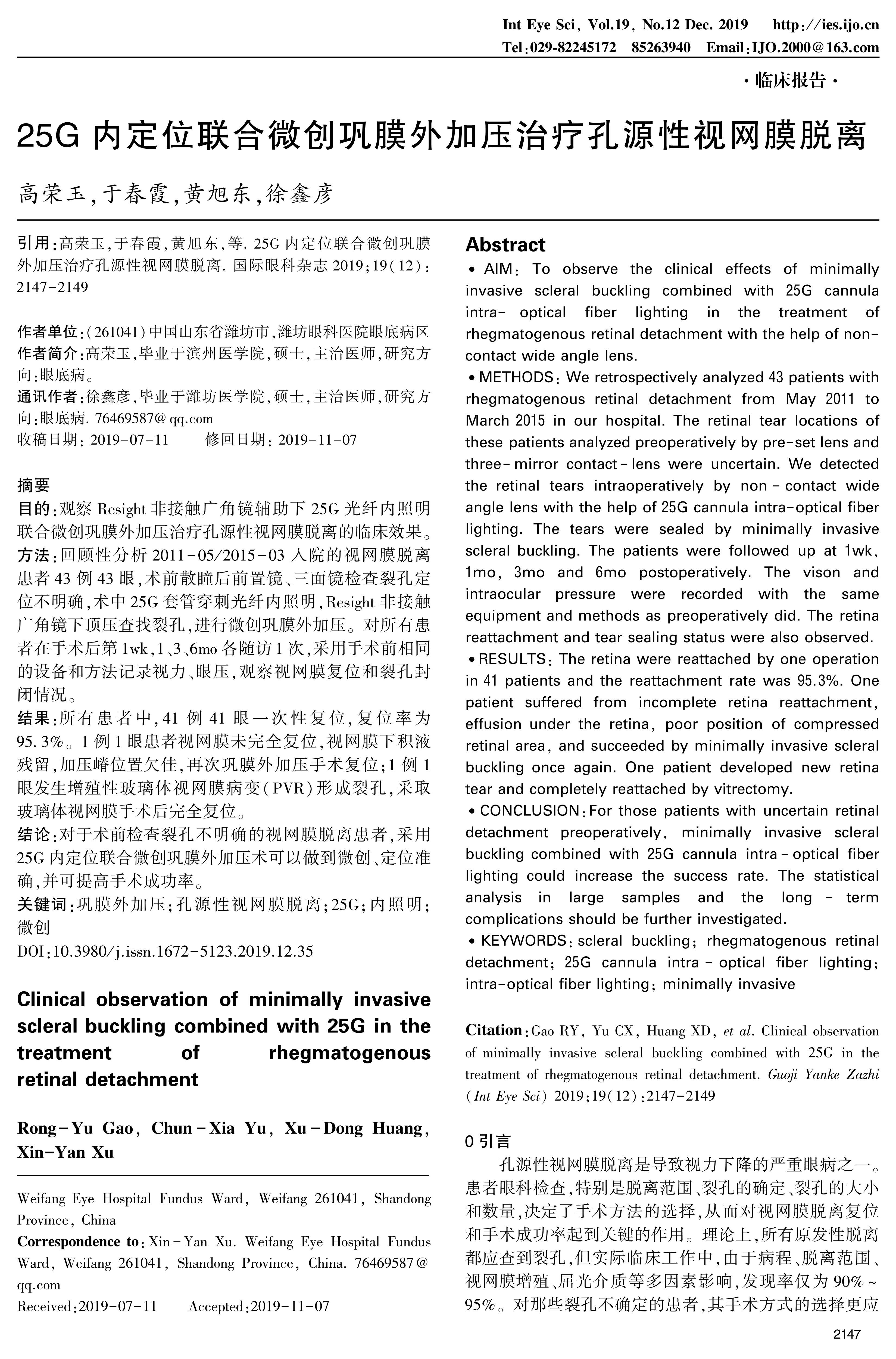 结论:对于术前检查裂孔不明确的视网膜脱离患者,采用25G内定位联合微创巩膜外加压术可以做到微创、定位准确,并可提高手术成功率。