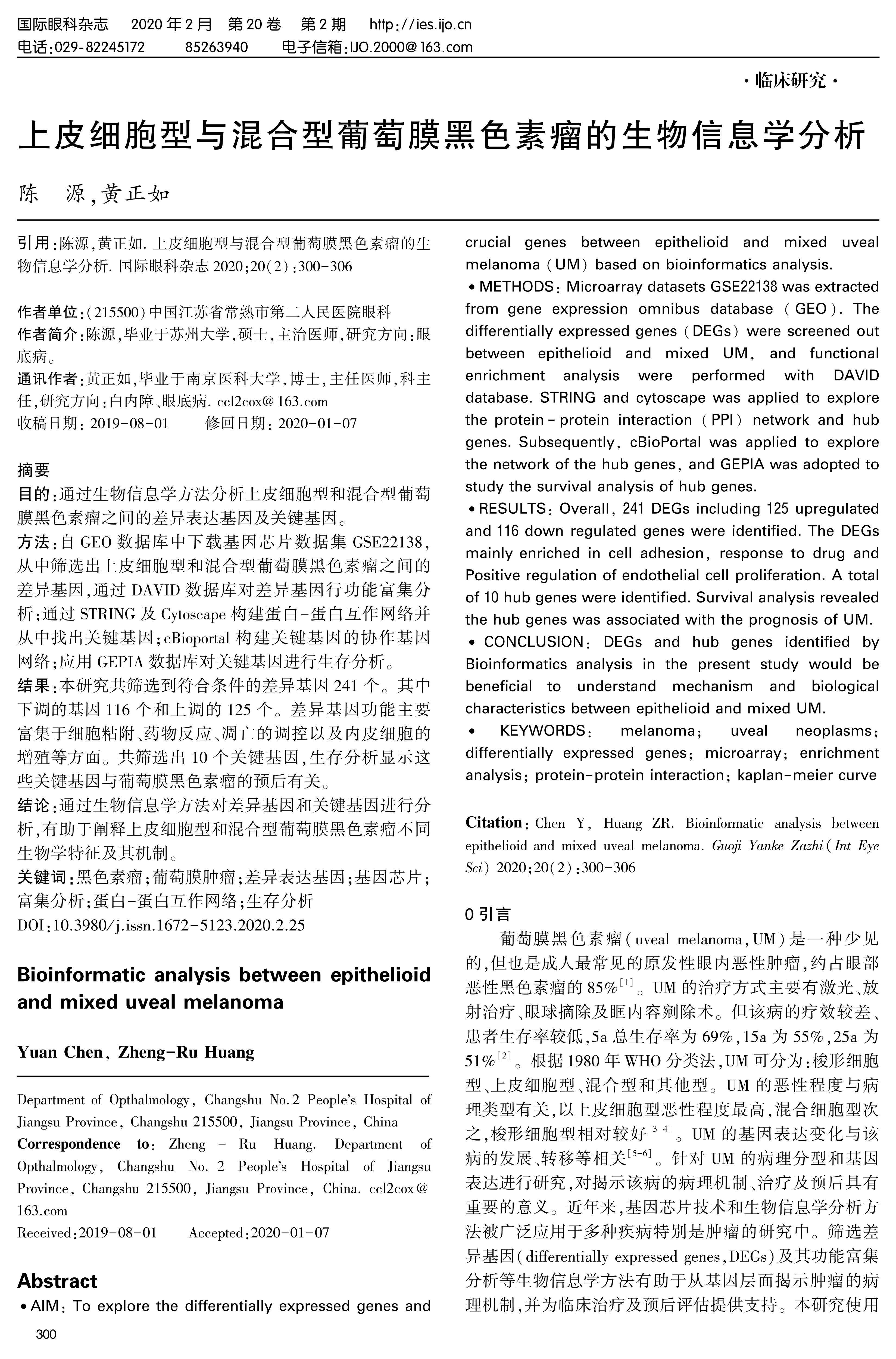 结论:通过生物信息学方法对差异基因和关键基因进行分析,有助于阐释上皮细胞型和混合型葡萄膜黑色素瘤不同生物学特征及其机制。