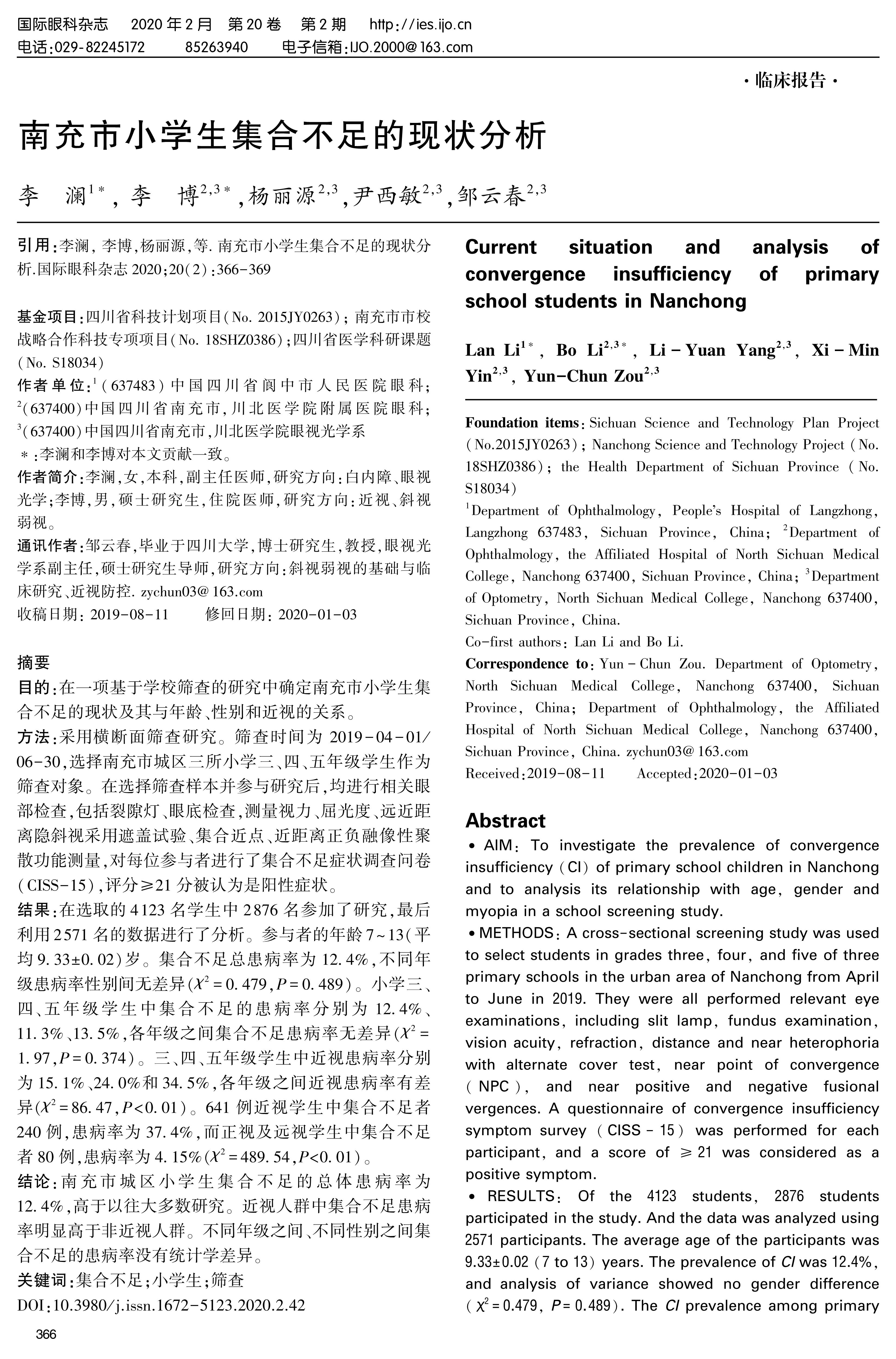 目的:在一项基于学校筛查的研究中确定南充市小学生集合不足的现状及其与年龄、性别和近视的关系。