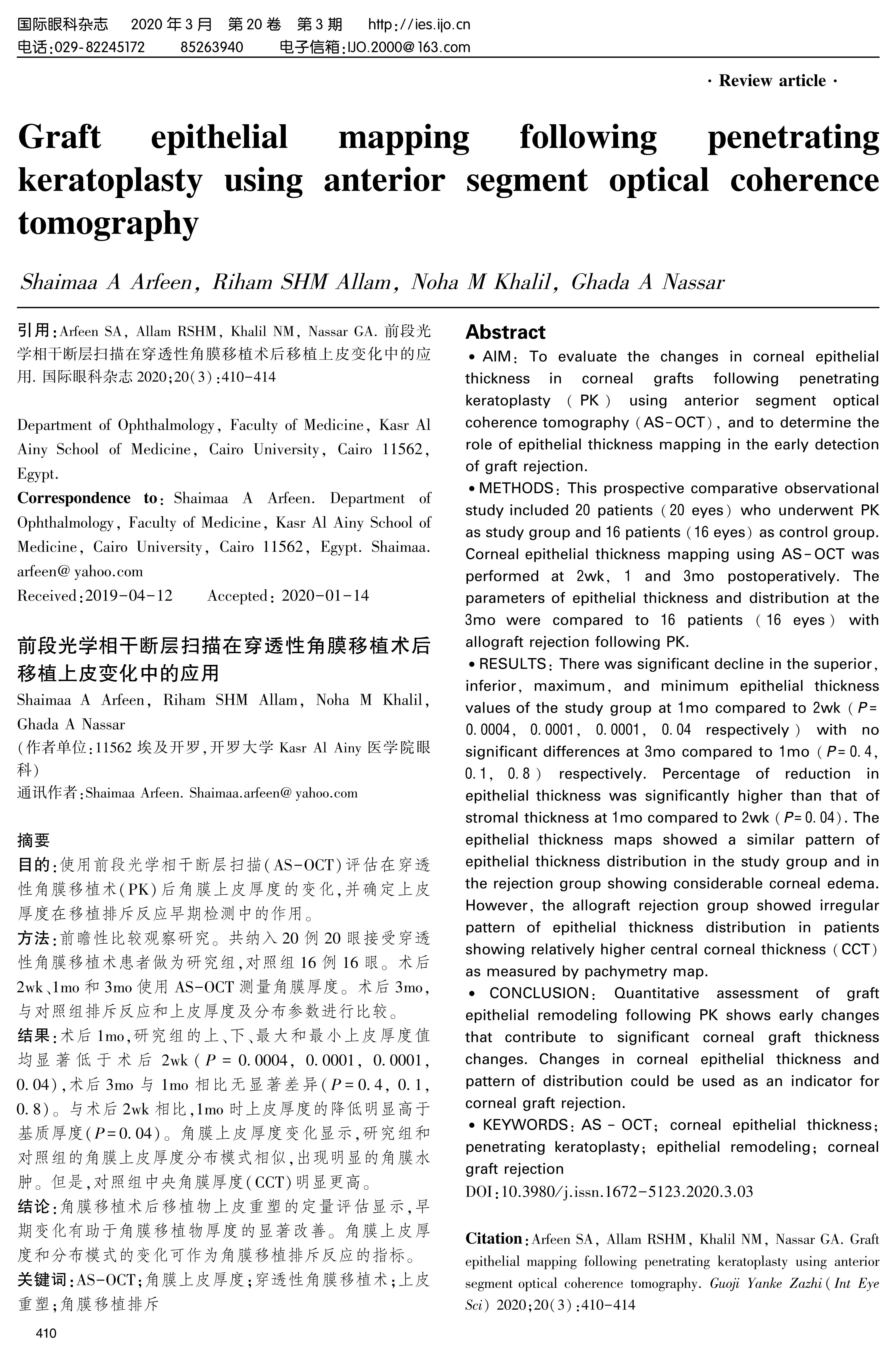 方法:前瞻性比较观察研究。共纳入20例20眼接受穿透性角膜移植术患者做为研究组,对照组16例16眼。术后2wk、1mo和3mo使用AS-OCT测量角膜厚度。术后3mo,与对照组排斥反应和上皮厚度及分布参数进行比较。