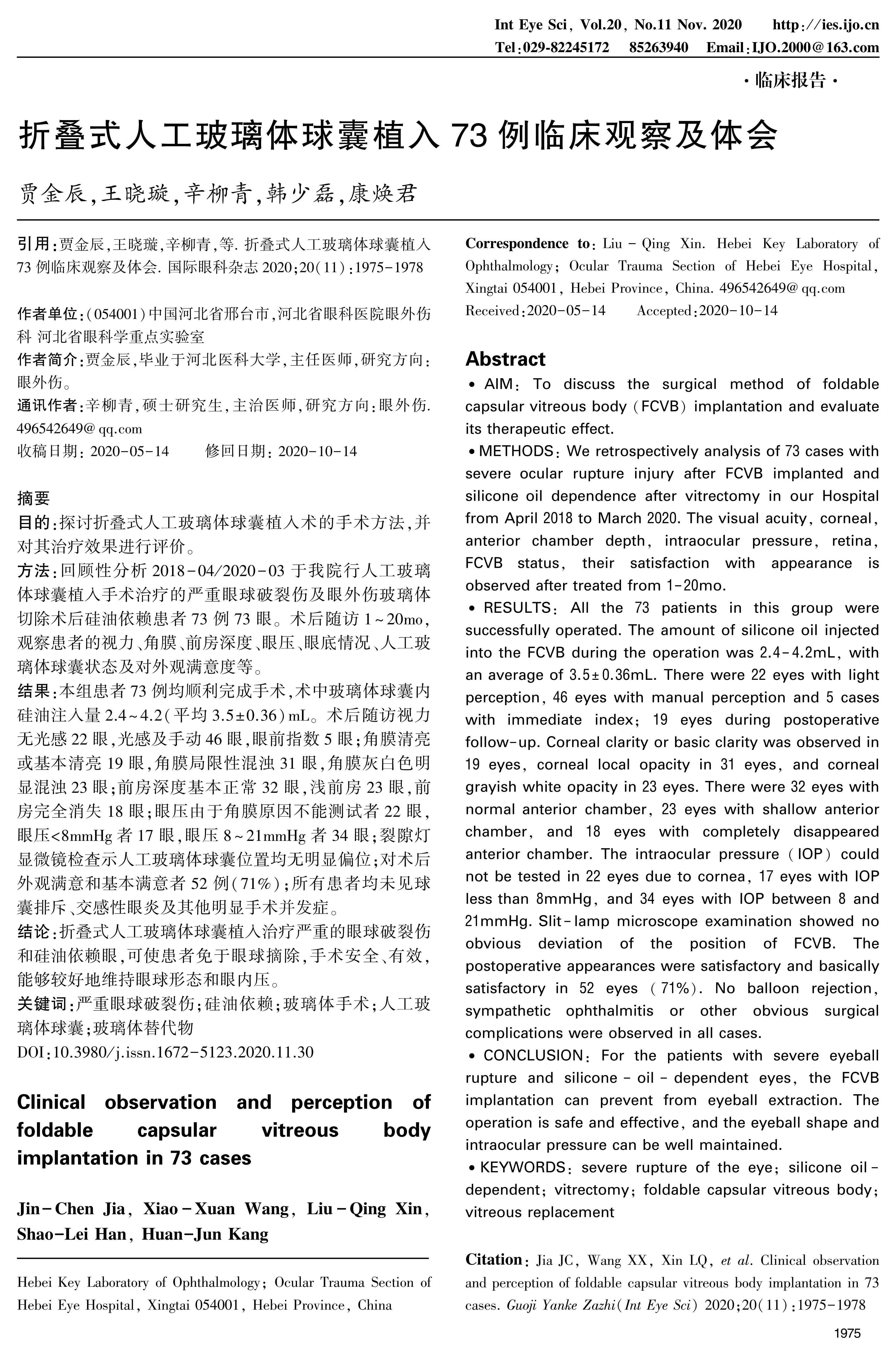 方法:回顾性分析2018-04/2020-03于我院行人工玻璃体球囊植入手术治疗的严重眼球破裂伤及眼外伤玻璃体切除术后硅油依赖患者73例73眼。术后随访1~20mo,观察患者的视力、角膜、前房深度、眼压、眼底情况、人工玻璃体球囊状态及对外观满意度等。