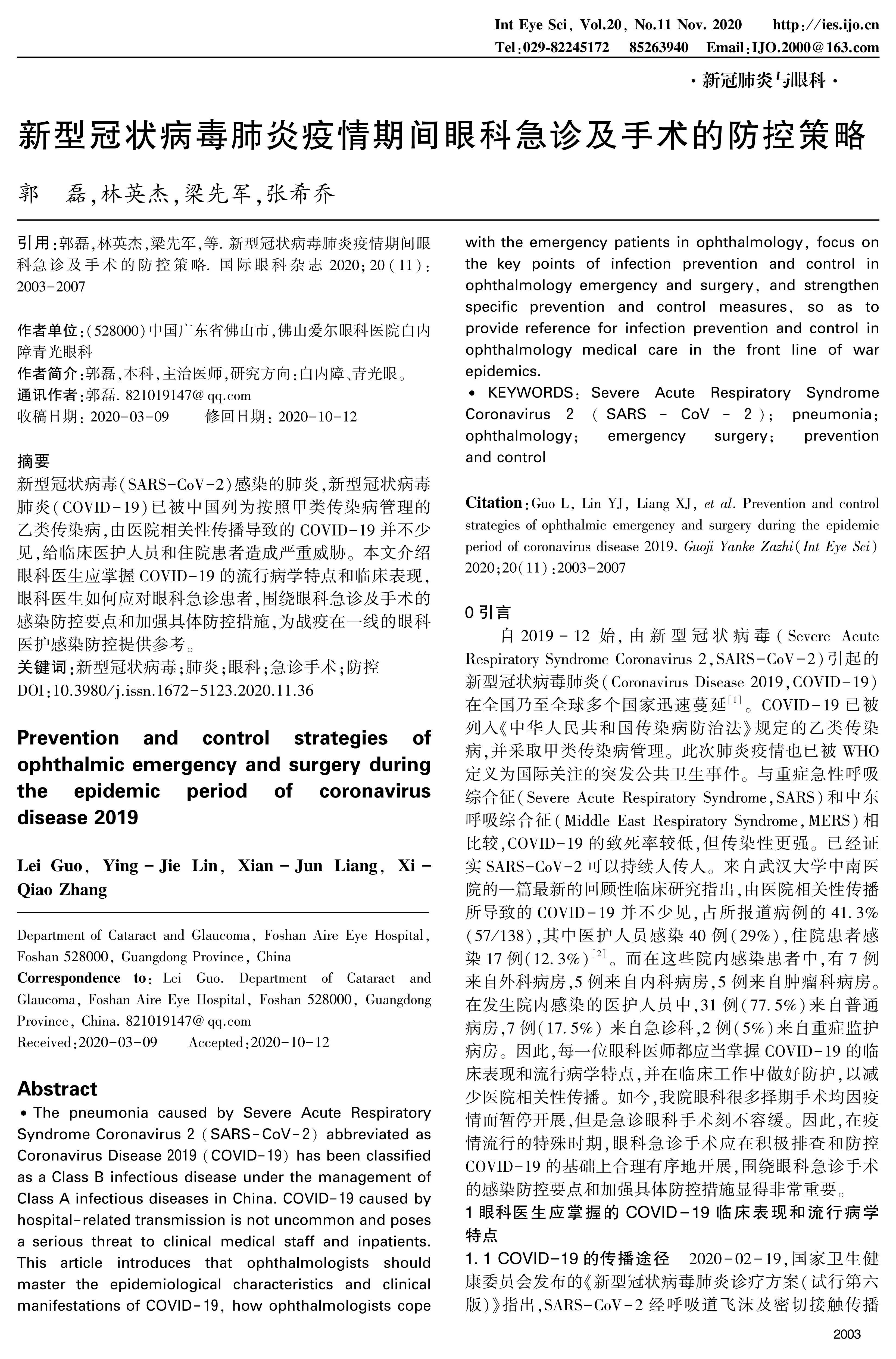 新型冠状病毒(SARS-CoV-2)感染的肺炎,新型冠状病毒肺炎(COVID-19)已被中国列为按照甲类传染病管理的乙类传染病,由医院相关性传播导致的COVID-19并不少见,给临床医护人员和住院患者造成严重威胁。本文介绍眼科医生应掌握COVID-19的流行病学特点和临床表现,眼科医生如何应对眼科急诊患者,围绕眼科急诊及手术的感染防控要点和加强具体防控措施,为战疫在一线的眼科医护感染防控提供参考。