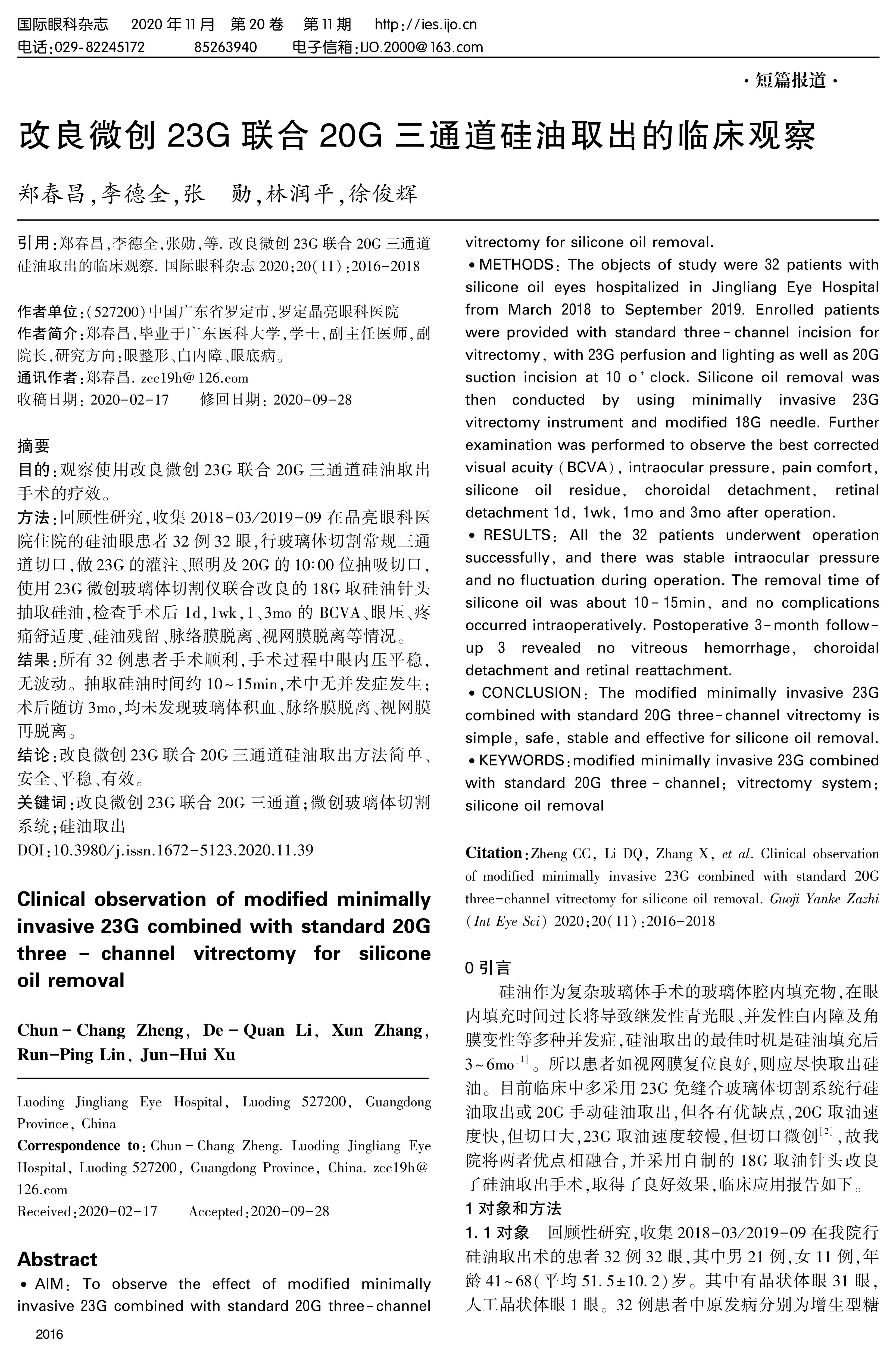 结论:改良微创23G联合20G三通道硅油取出方法简单、安全、平稳、有效。
