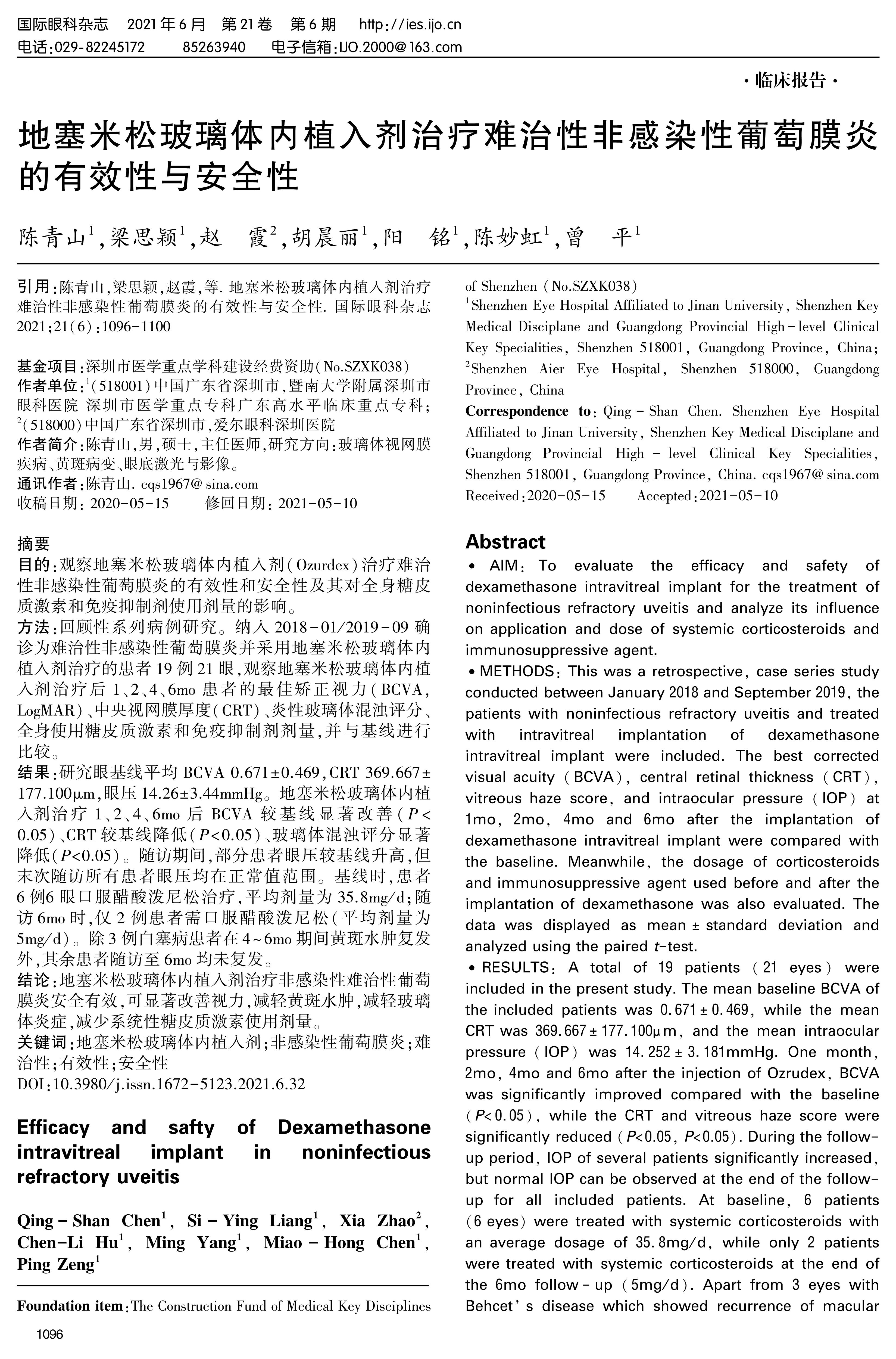 方法:回顾性系列病例研究。纳入2018-01/2019-09确诊为难治性非感染性葡萄膜炎并采用地塞米松玻璃体内植入剂治疗的患者19例21眼,观察地塞米松玻璃体内植入剂治疗后1、2、4、6mo患者的最佳矫正视力(BCVA,LogMAR)、中央视网膜厚度(CRT)、炎性玻璃体混浊评分、全身使用糖皮质激素和免疫抑制剂剂量,并与基线进行比较。