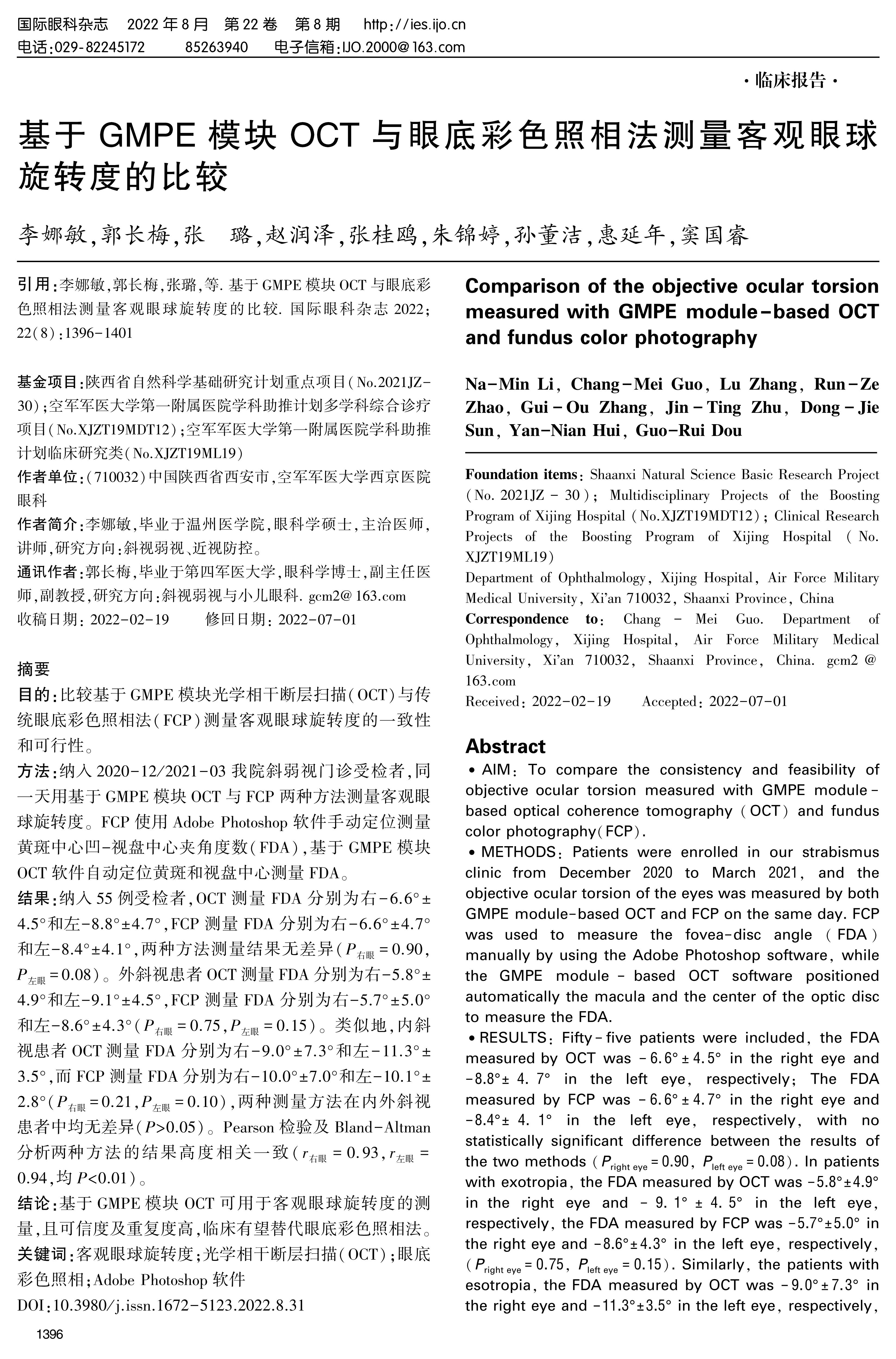 METHODS: Patients were enrolled in our strabismus clinic from December 2020 to March 2021, and the objective ocular torsion of the eyes was measured by both GMPE module-based OCT and FCP on the same day. FCP was used to measure the fovea-disc angle(FDA)manually by using the Adobe Photoshop software, while the GMPE module-based OCT software positioned automatically the macula and the center of the optic disc to measure the FDA.
