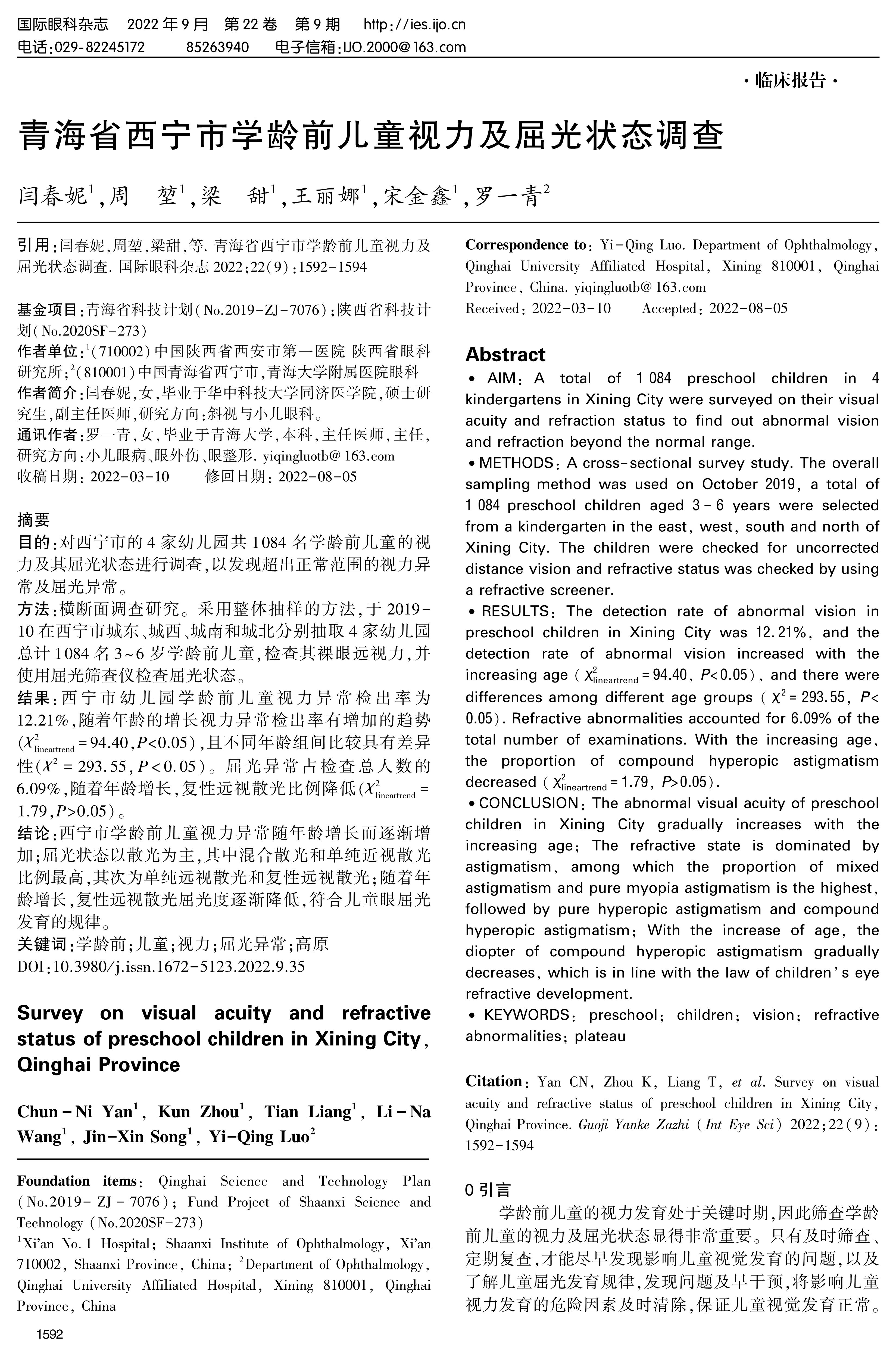 AIM:A total of 1 084 preschool children in 4 kindergartens in Xining City were surveyed on their visual acuity and refraction status to find out abnormal vision and refraction beyond the normal range.
