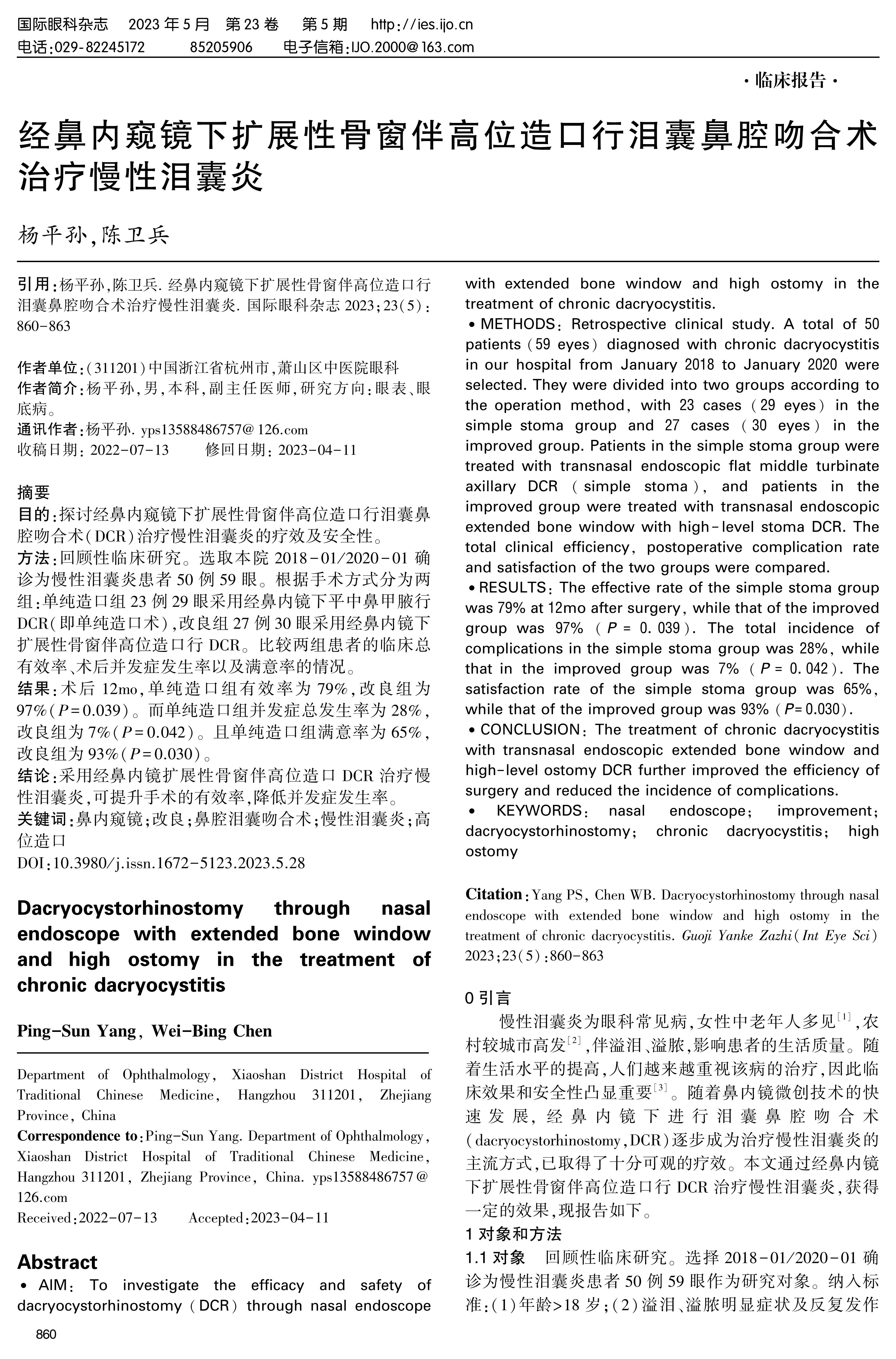 CONCLUSION: The treatment of chronic dacryocystitis with transnasal endoscopic extended bone window and high-level ostomy DCR further improved the efficiency of surgery and reduced the incidence of complications.